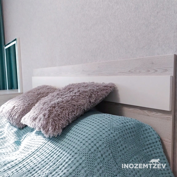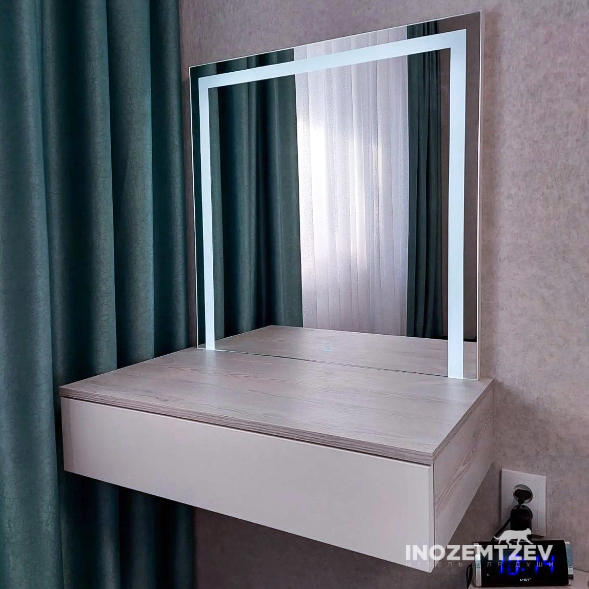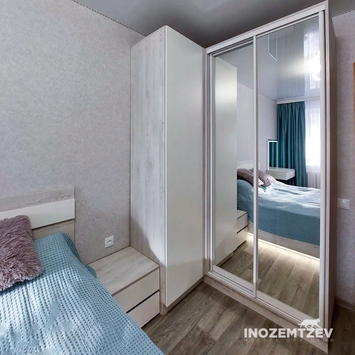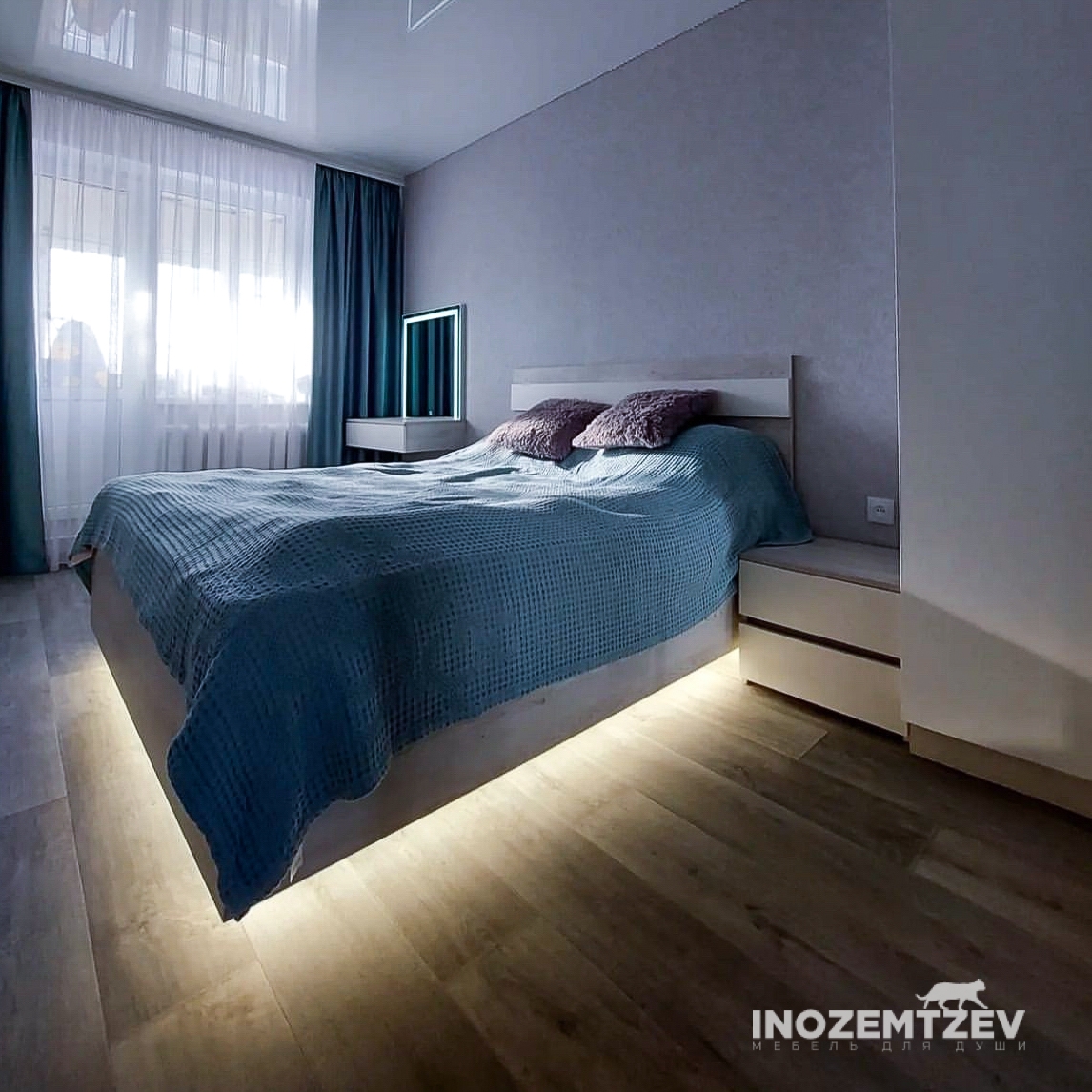Комплект мебели в спальную комнату: парящая кровать с изголовьем и подсветкой, прикроватные тумбочки, макияжный столик с зеркалом и угловой зеркальный шкаф. Материал: ЛДСП Egger