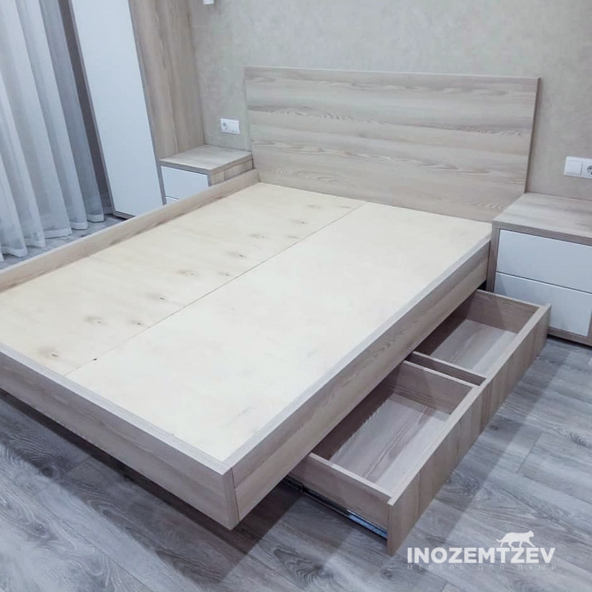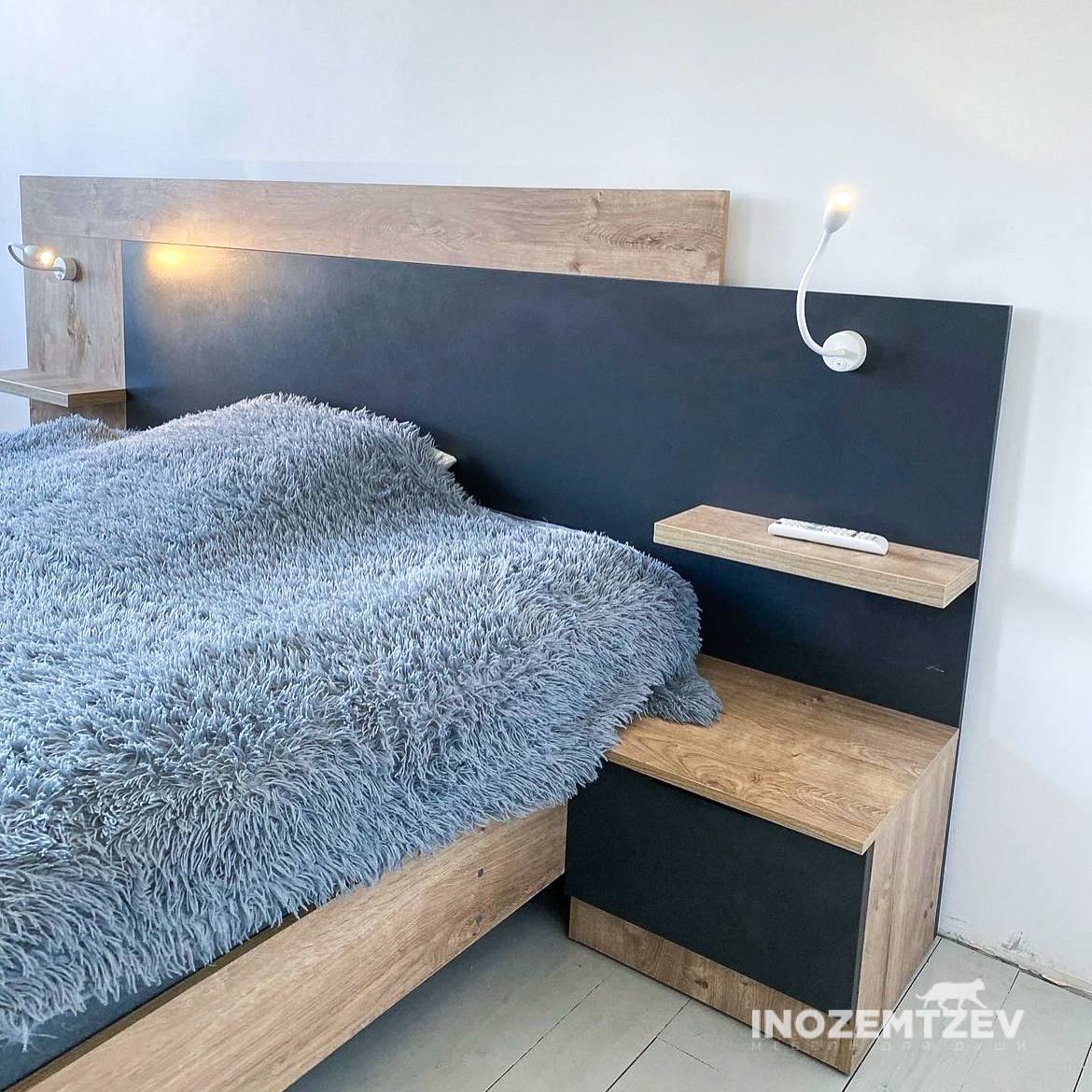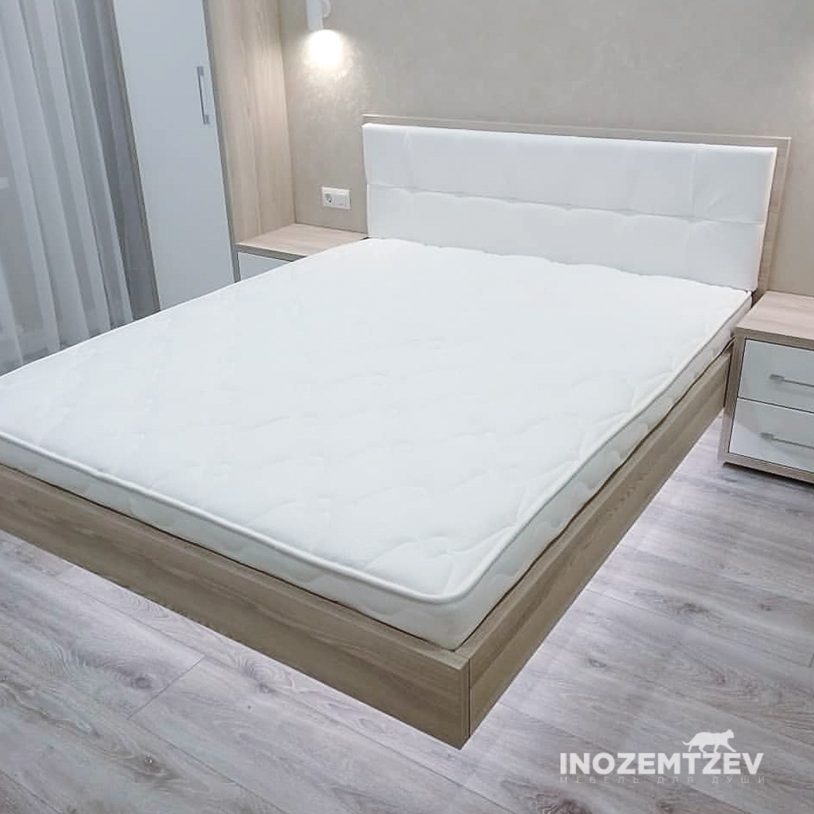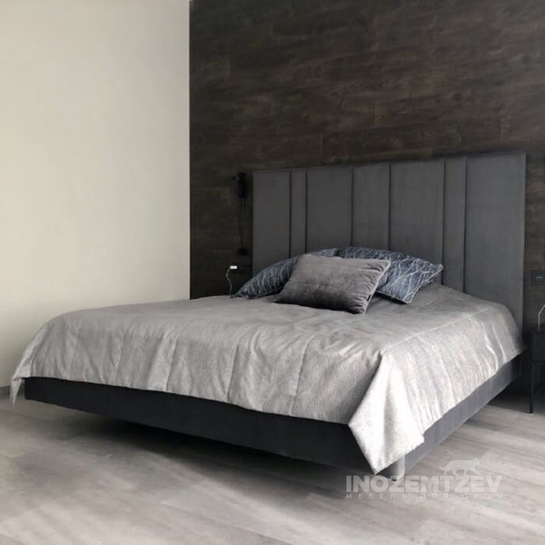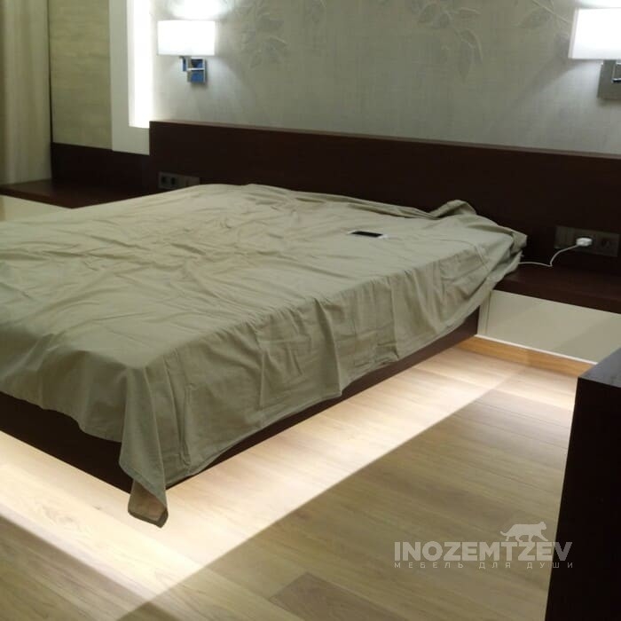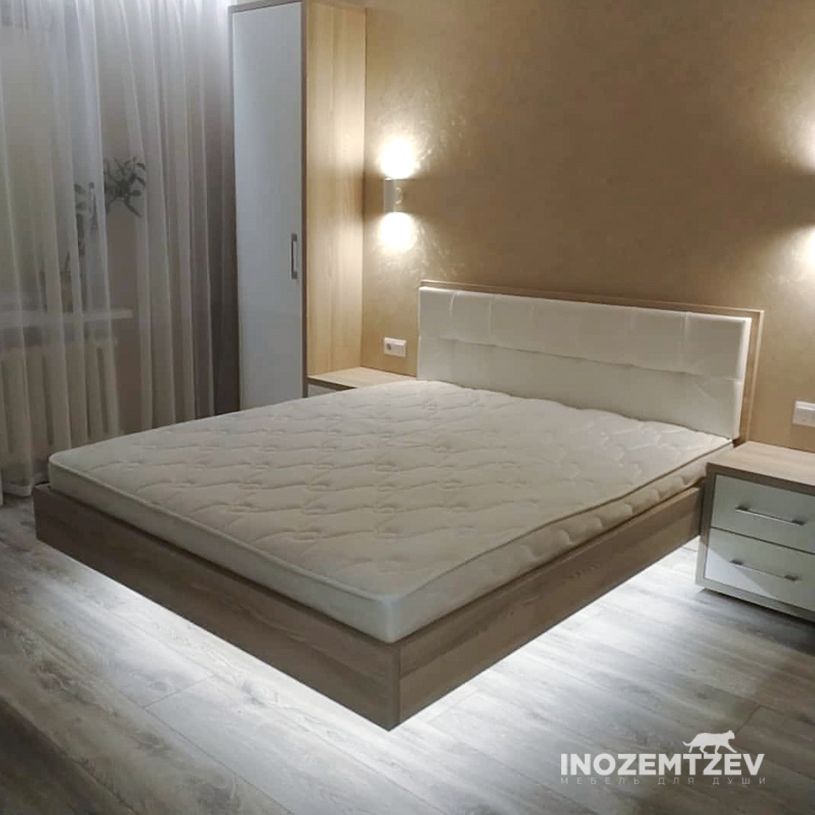 Парящая кровать с изголовьем и напольными прикроватными тумбочками