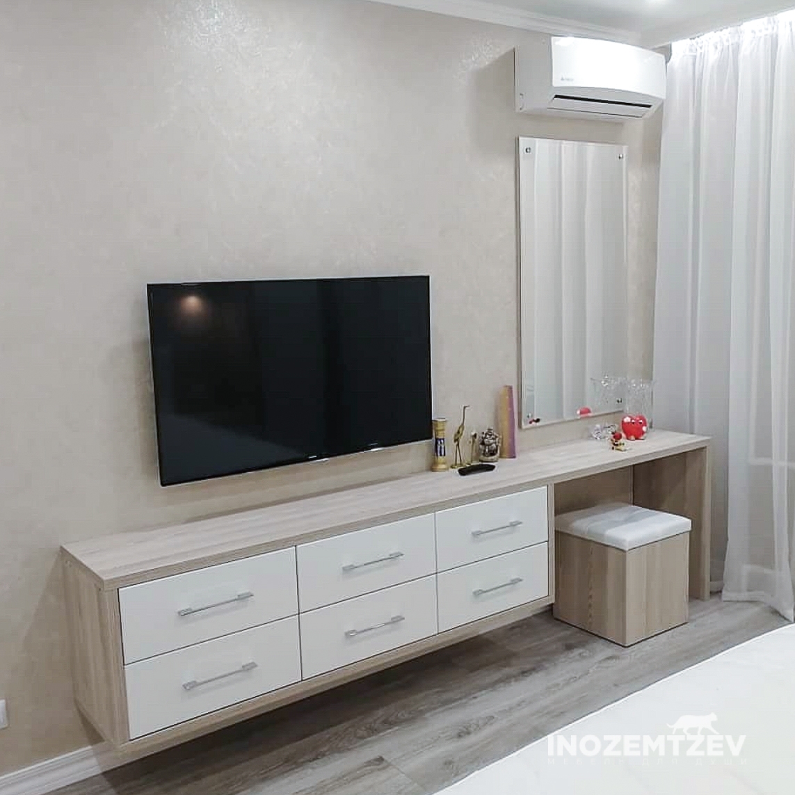 Комплект мебели в спальню из ЛДСП Egger: парящая кровать с подсветкой, напольные прикроватные тумбочки с выдвижными ящиками, шкаф пенал, тумба под телевизор и письменный стол вместе
