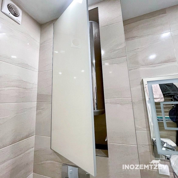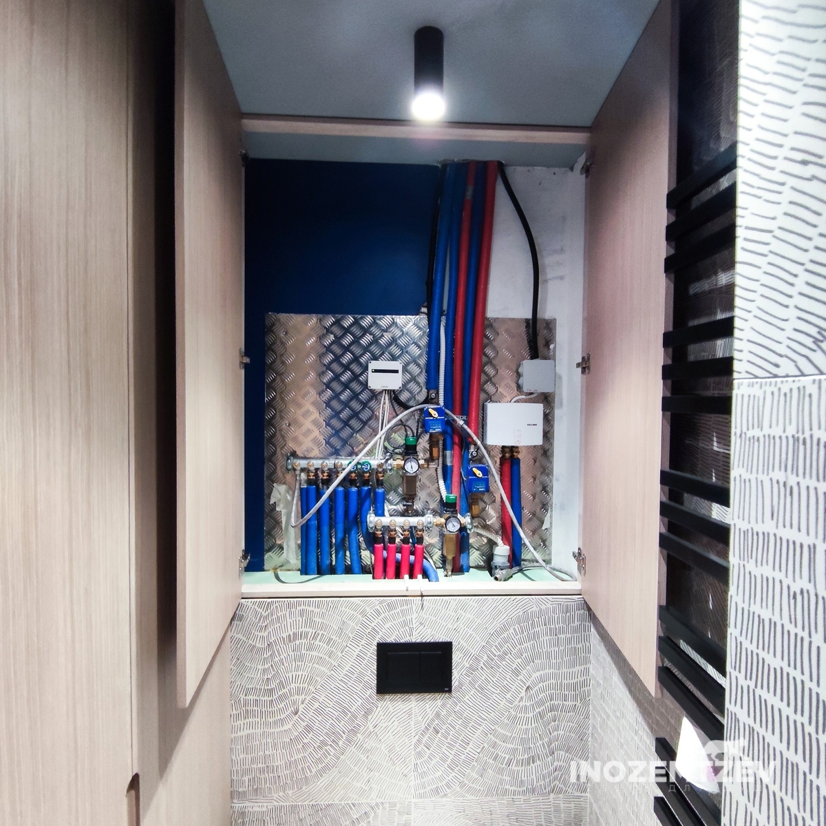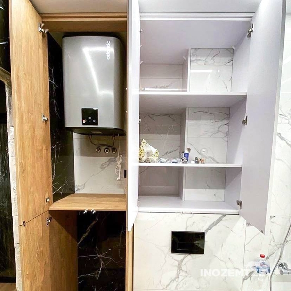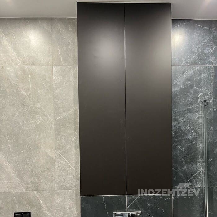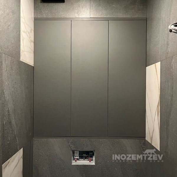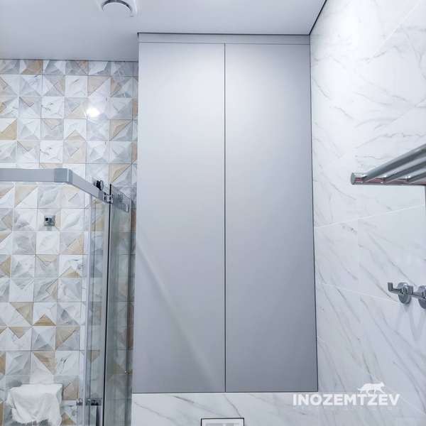 Дверцы для сантехнического шкафа в цвет стен. Размеры: 1470х980 мм. Материал: МДФ эмаль и ЛДСП Egger Орех Дижон натуральный. Система открывания push-to-open, петли fgv Италия