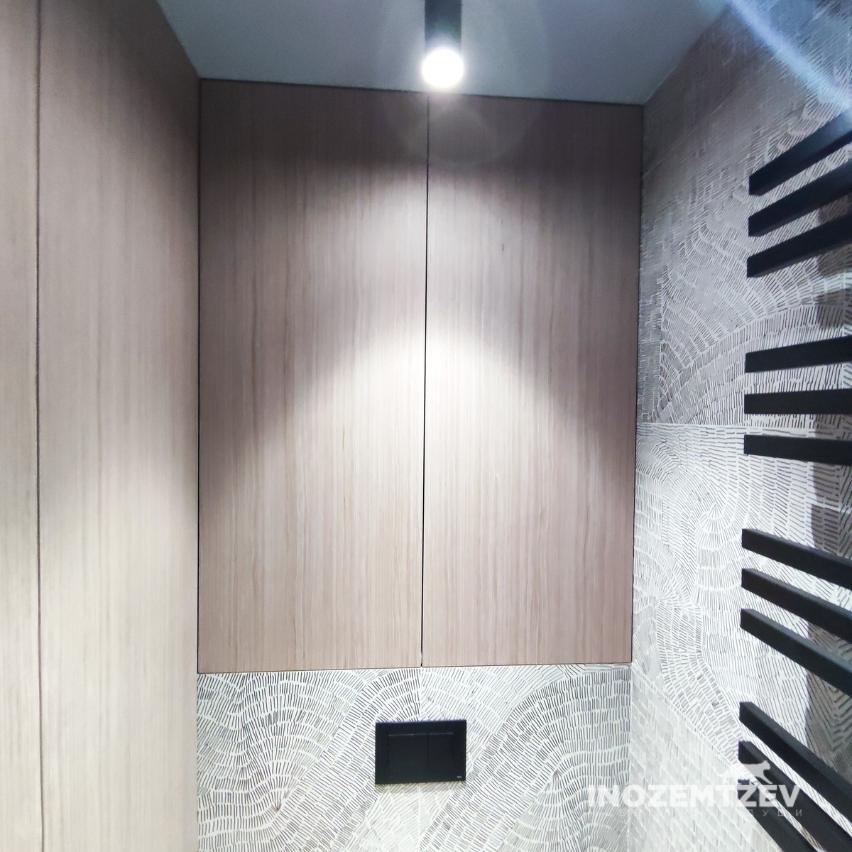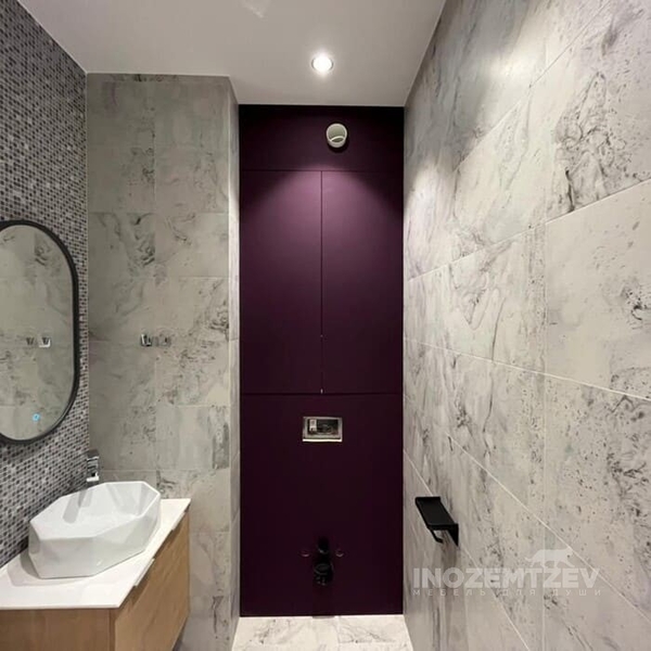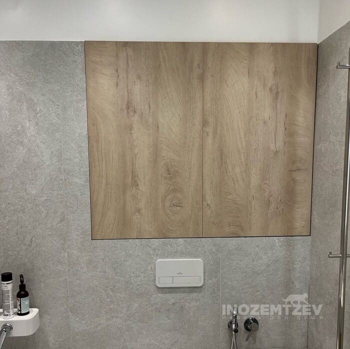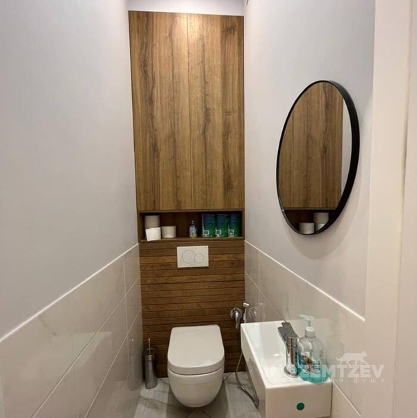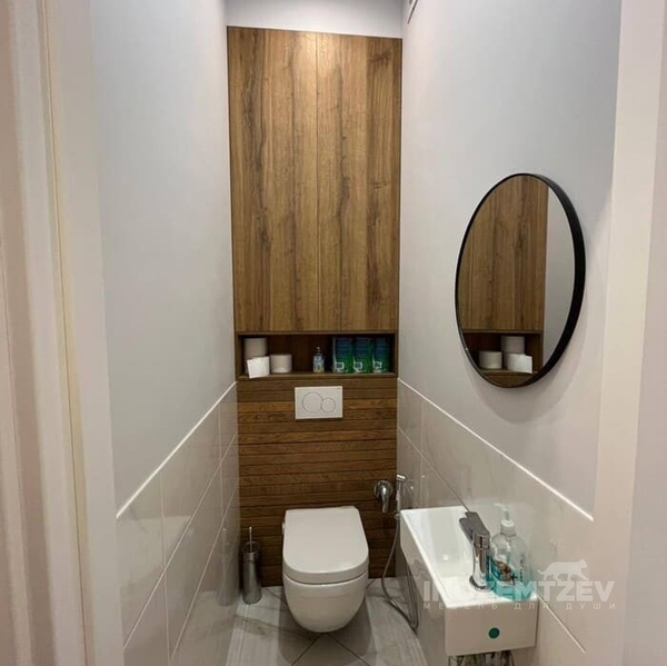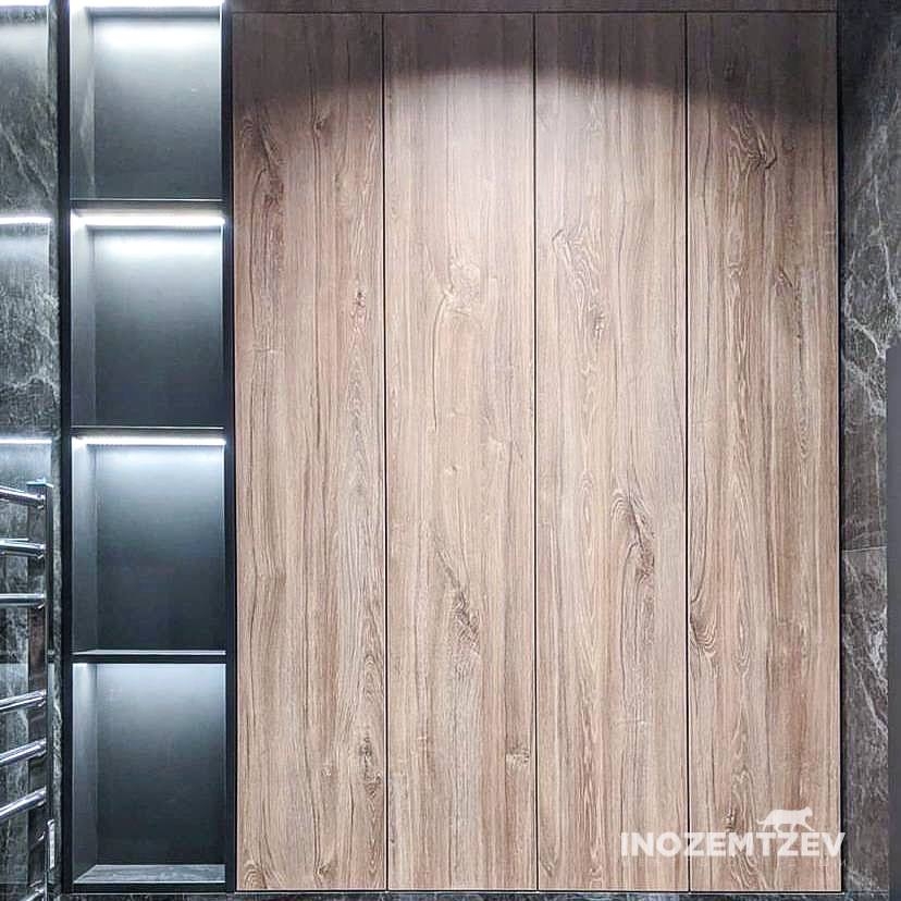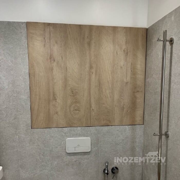 Дверцы в туалете за унитазом из текстурного ЛДСП Egger в один уровень со стеной