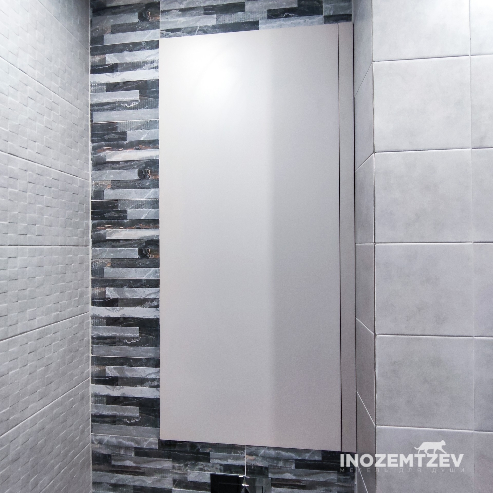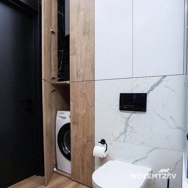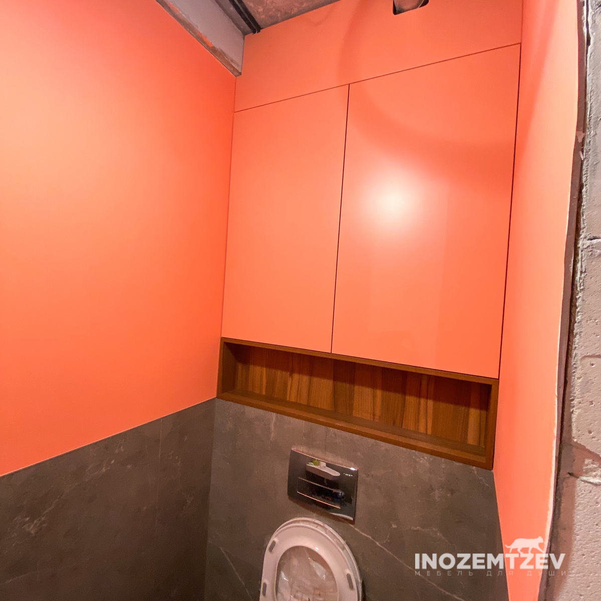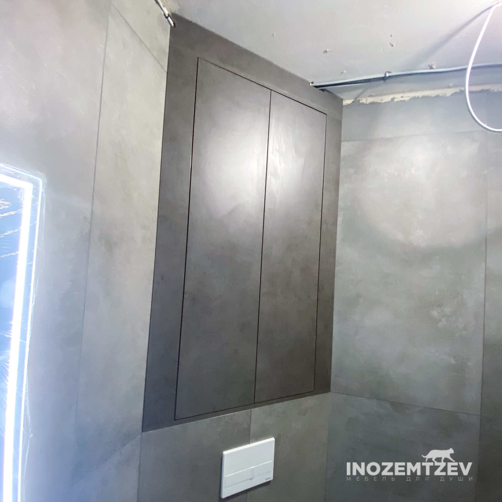 Дверцы в туалете за унитазом из текстурного ЛДСП Egger в один уровень со стеной