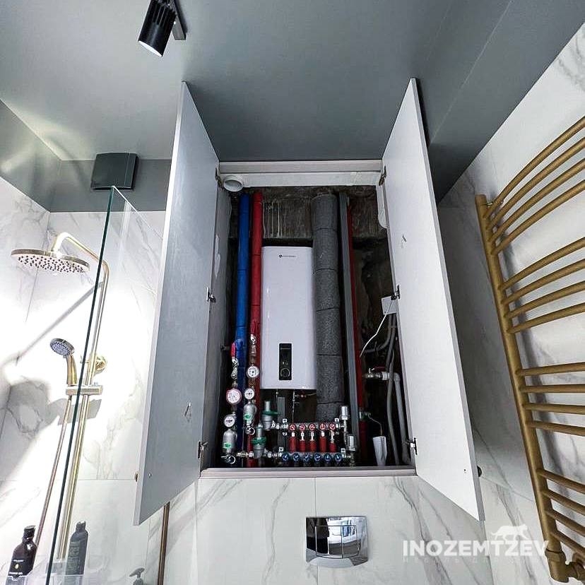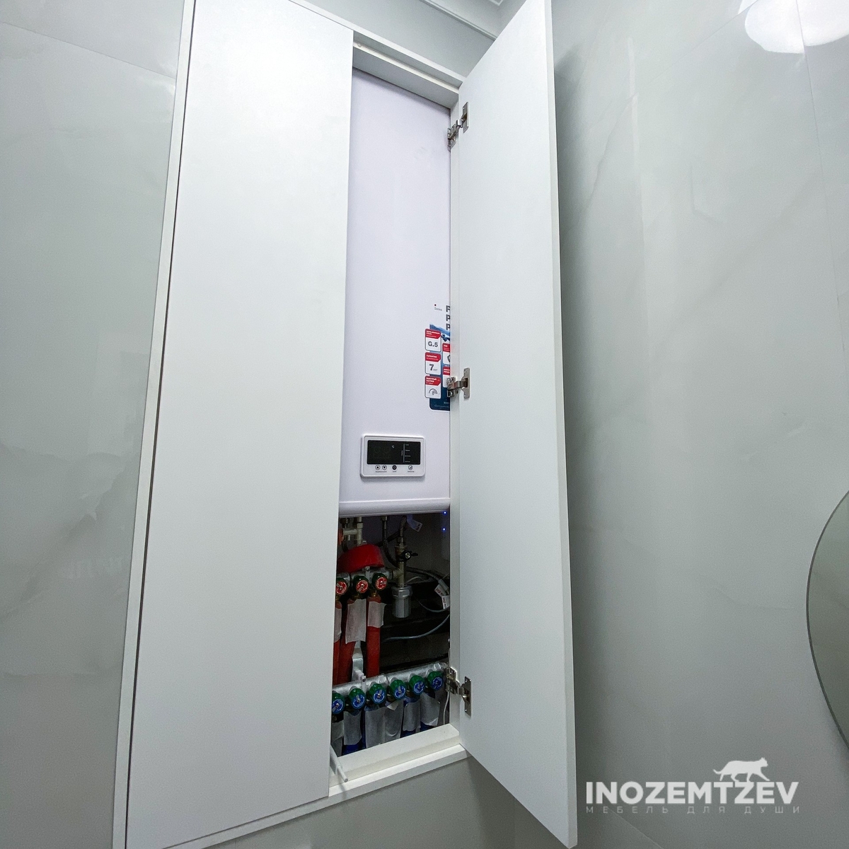 Белые дверки в туалете за унитазом для маскировки бойлера и коммуникаций