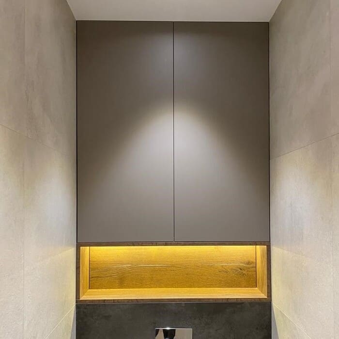 Дверцы для сантехнического шкафа в туалете с открытыми полочками с подсветкой в сочетании двух цветовых решений: однотонного и текстурного под дерево
