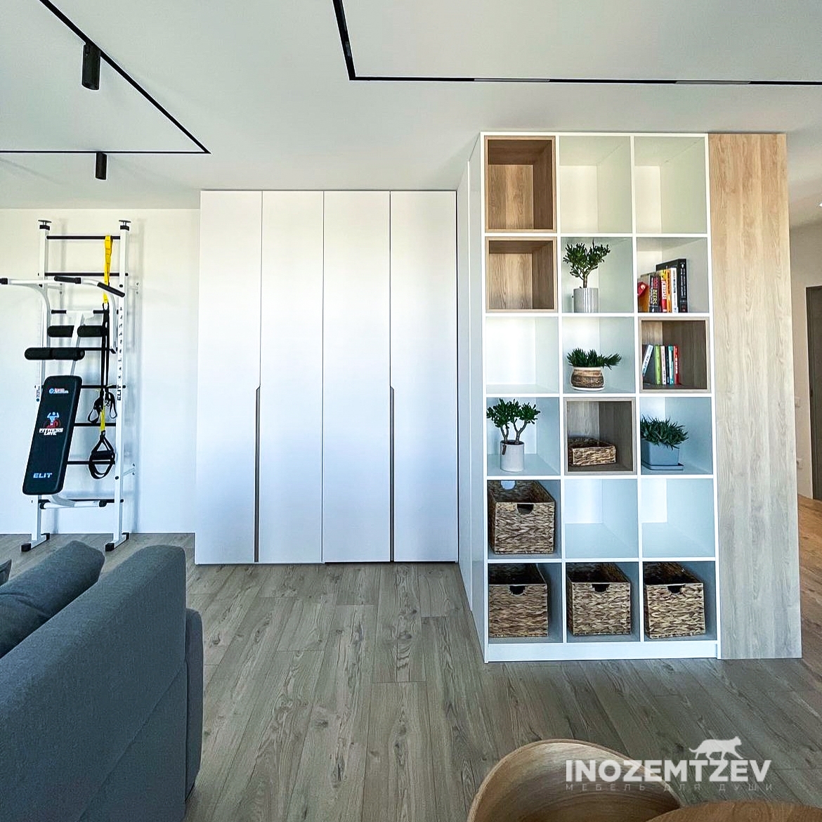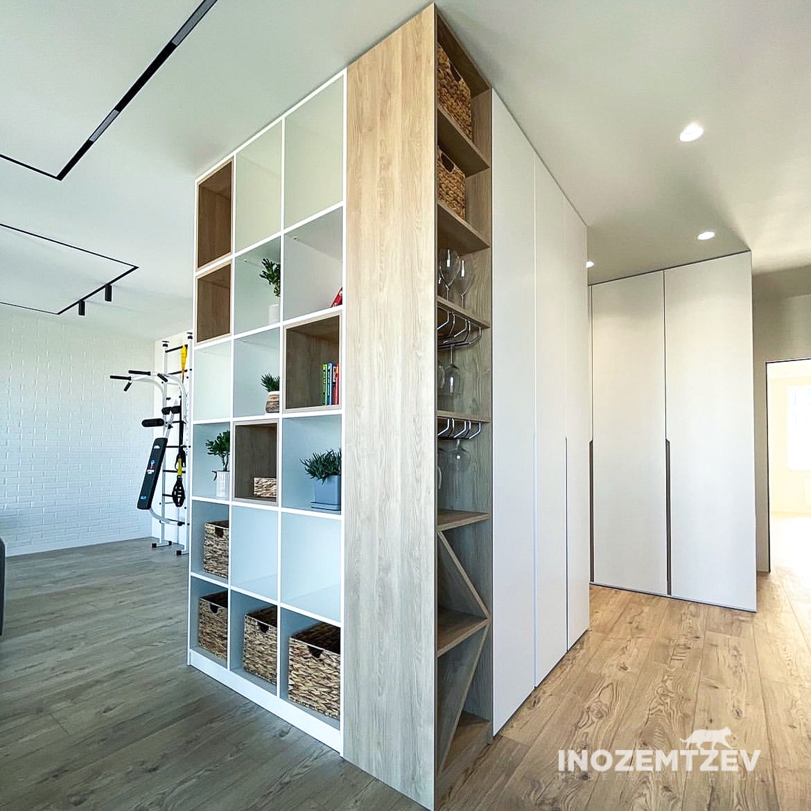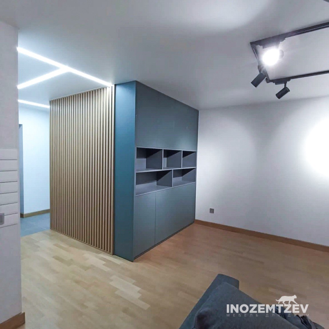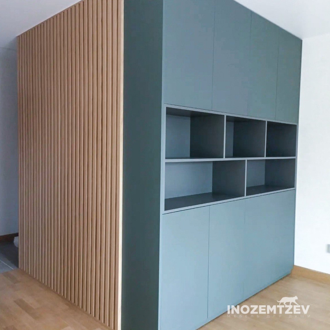 Шкаф для зонирование комнаты в комбинации с декоративной перегородкой в виде реек