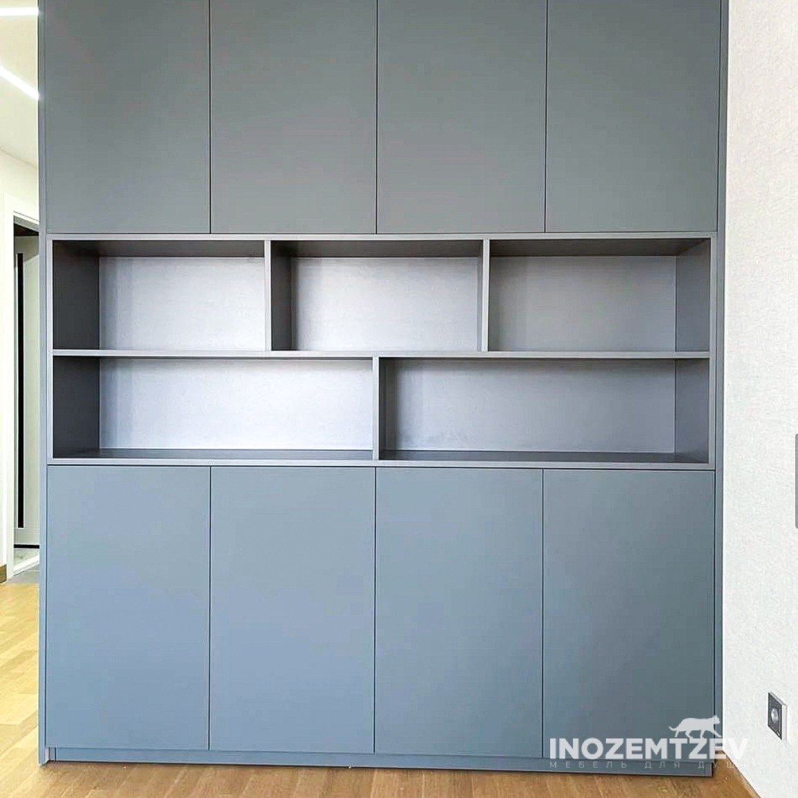 Двухсторонний шкаф перегородка с интегрированными ручками и открытыми полками в современном стиле
