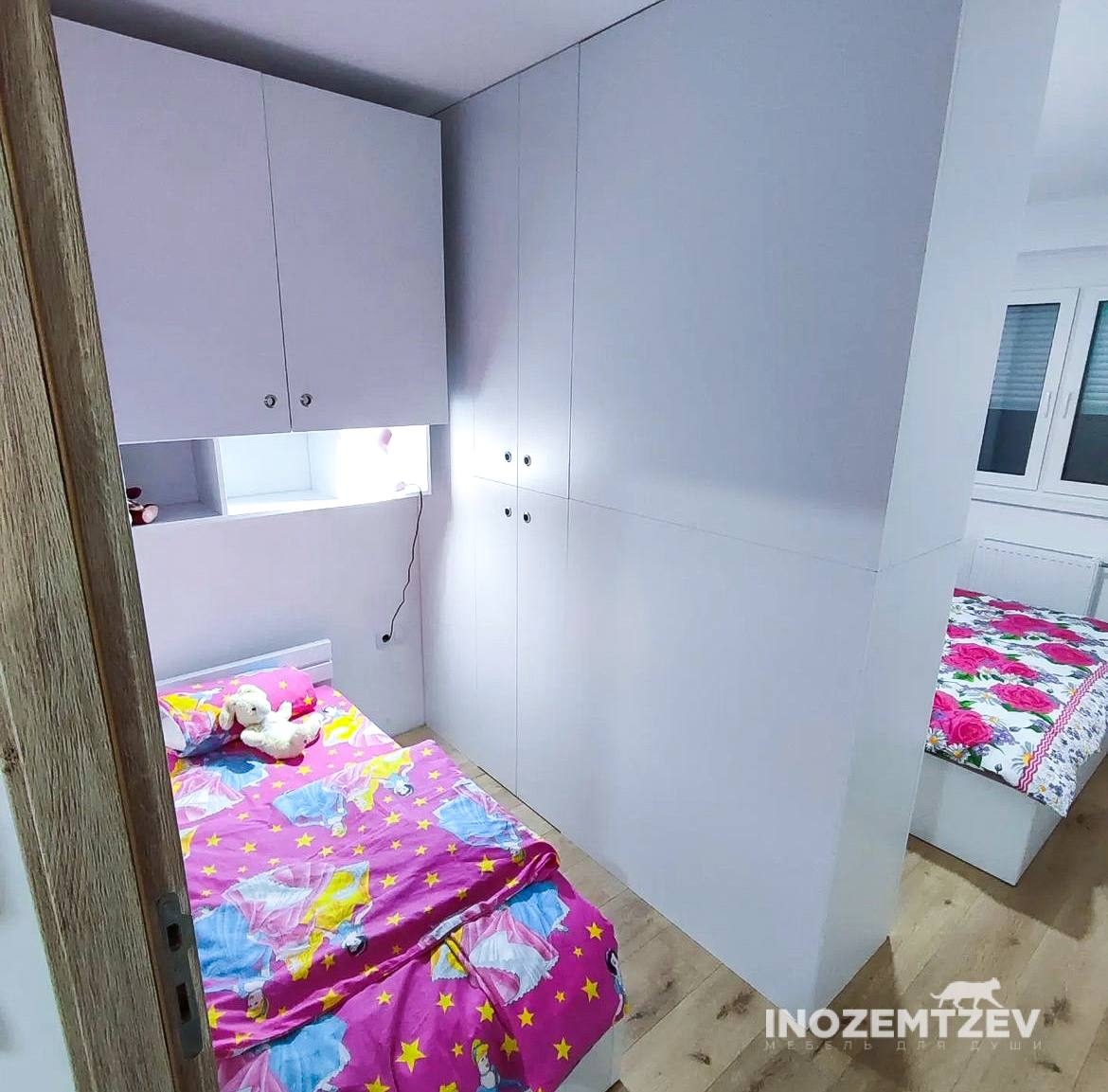 Зонирование детской комнаты для двоих девочек с помощью шкафа и обустройство комнаты в белом цвете