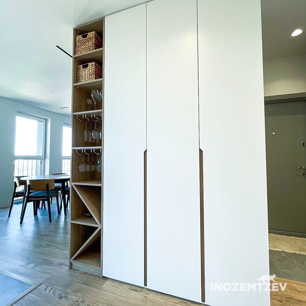 Перегородка шкаф для зонирования с проходом в спальное место с раздвижной дверью, заезжующей в шкаф. Выполнен из ЛДСП Egger