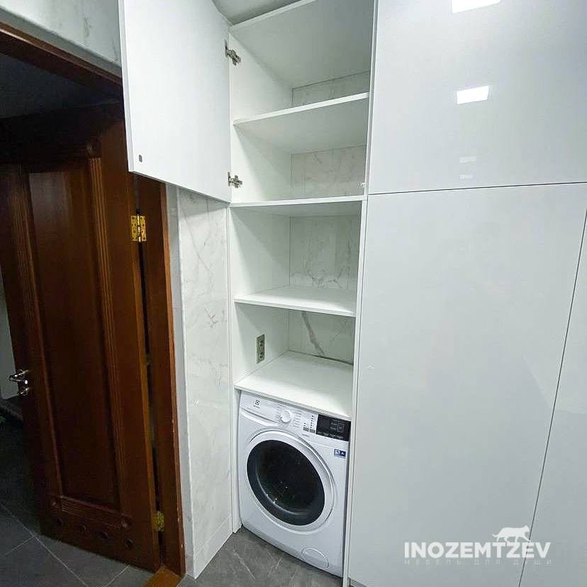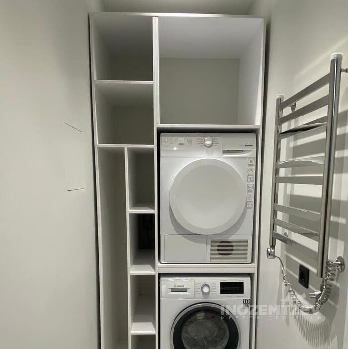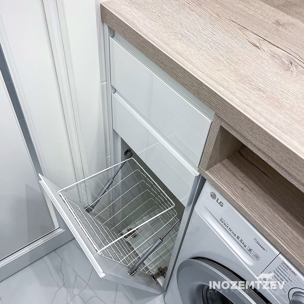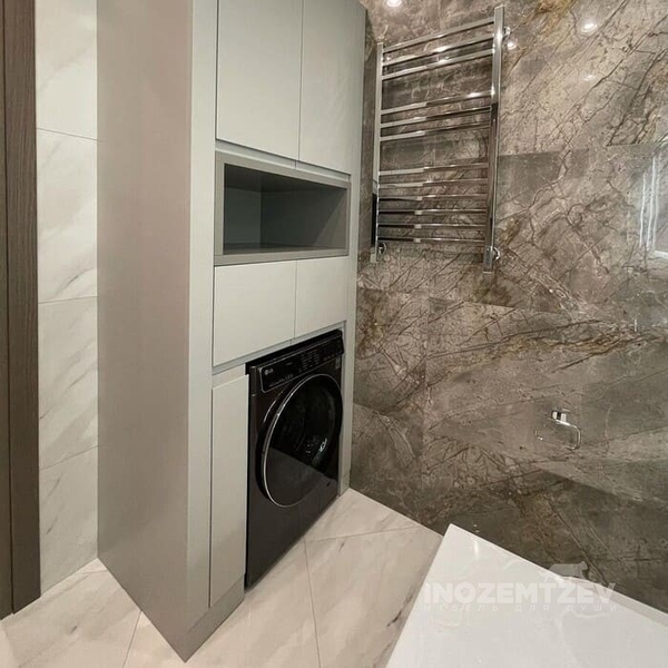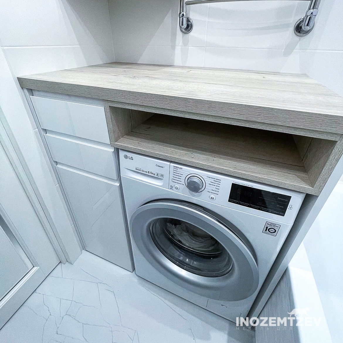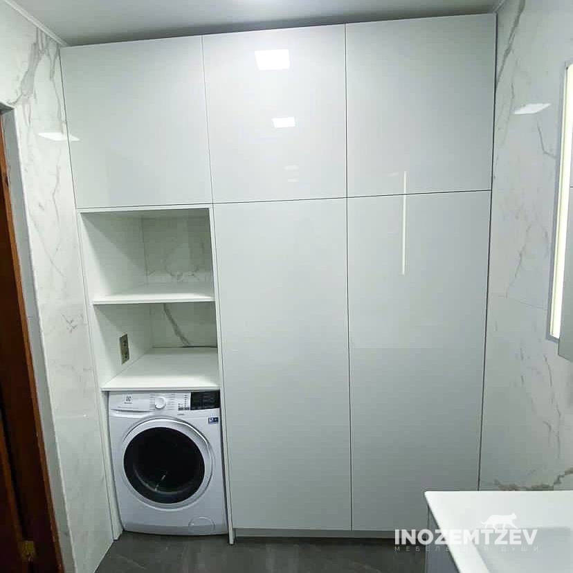 Встроенный шкаф для стиральной машины в ванной с глянцевыми фасадами