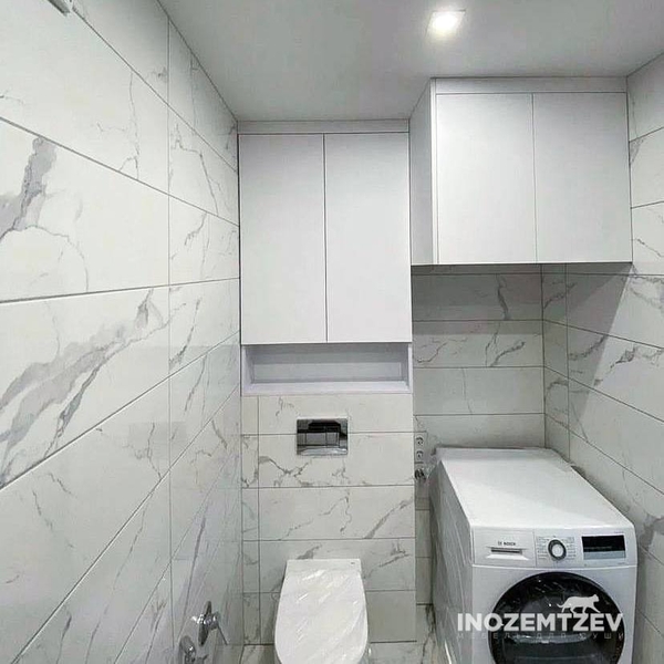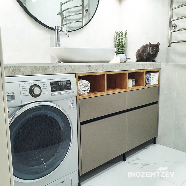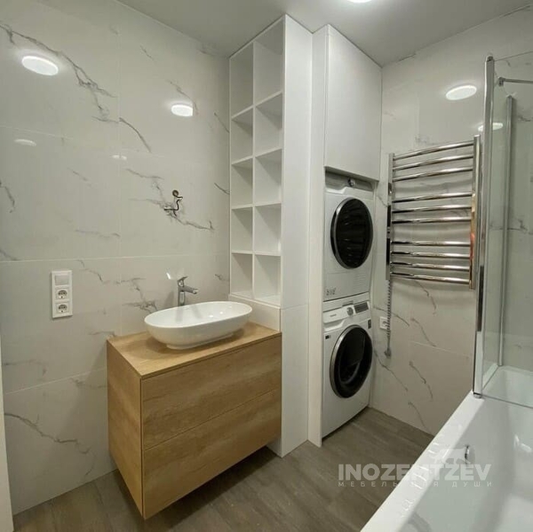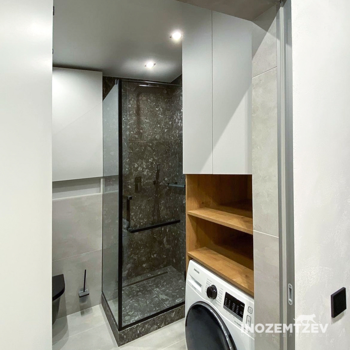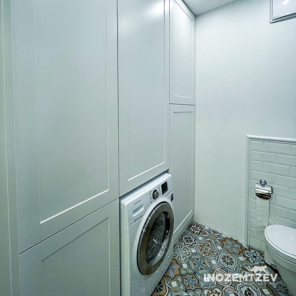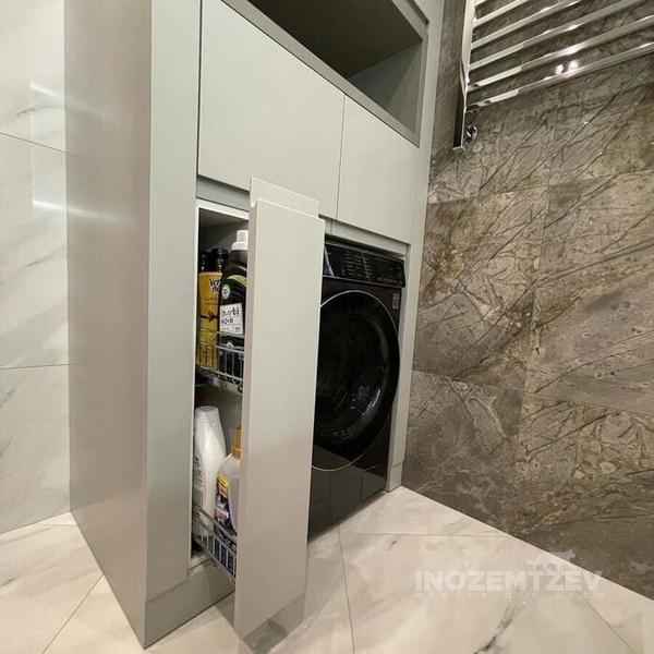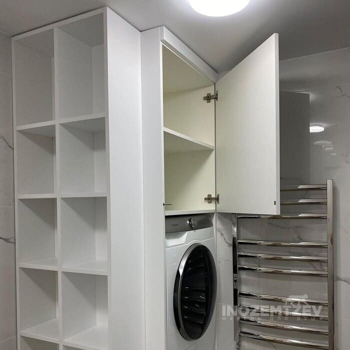 Встроенный шкаф для стиральной машины в ванной с глянцевыми фасадами