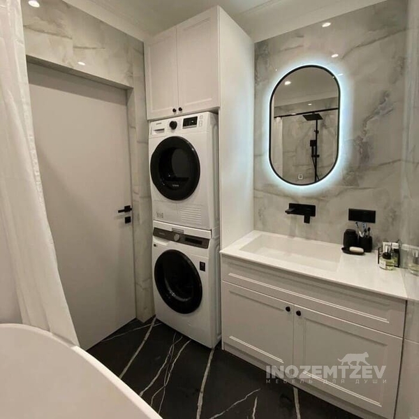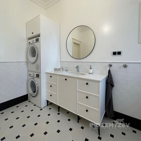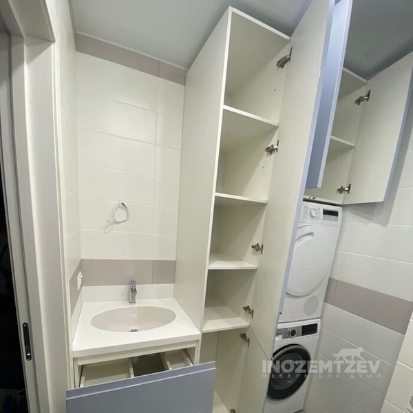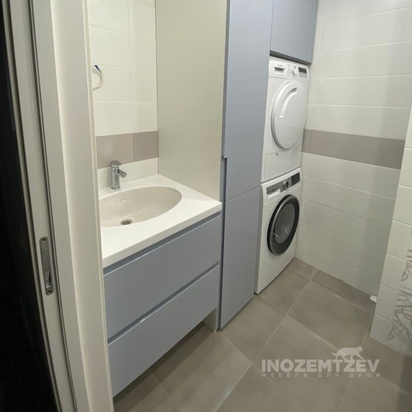 Небольшой комплекс в ванную комнату из МДФ эмали: пенал под стиральную и сушильную машину и тумба на ножках