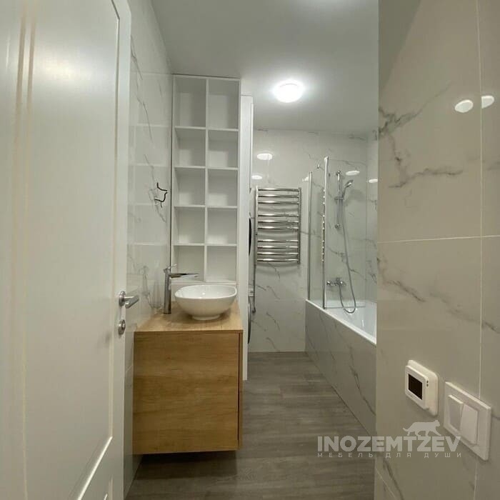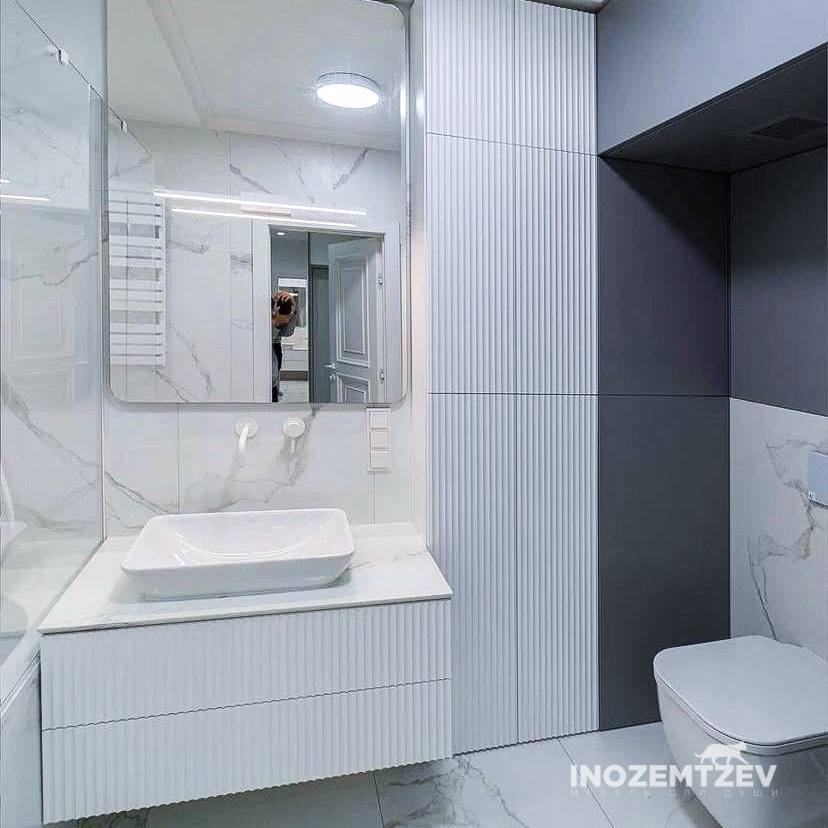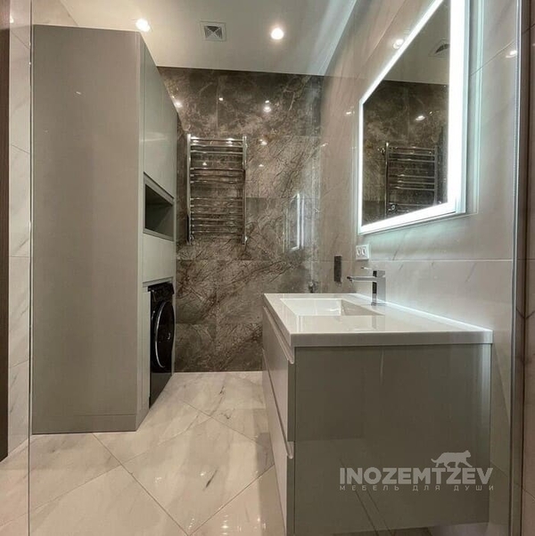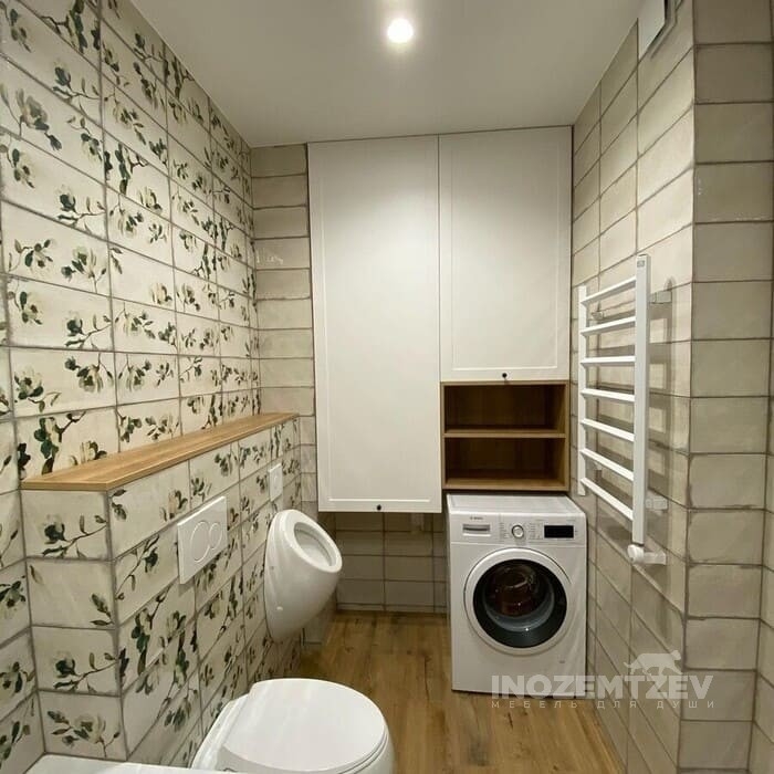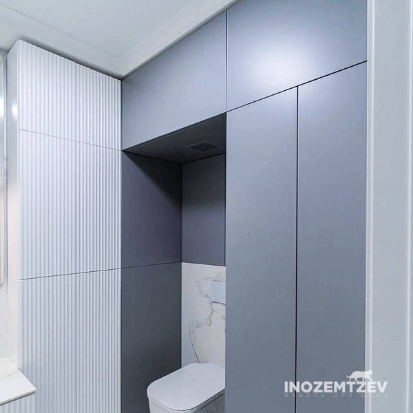Современный комплект мебели в ванную комнату из гладкого и фрезерованного МДФ: тумба со столешницей под раковину, шкаф в нишу, шкафчик над инсталляцией и шкаф для сушильной и стиральной машины
