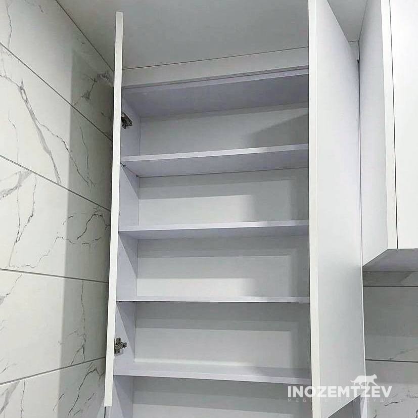 Шкаф навесной над стиральной машиной в ванной из МДФ AGT и ЛДСП Egger Белый влагостойкий, фрезеровка в полках