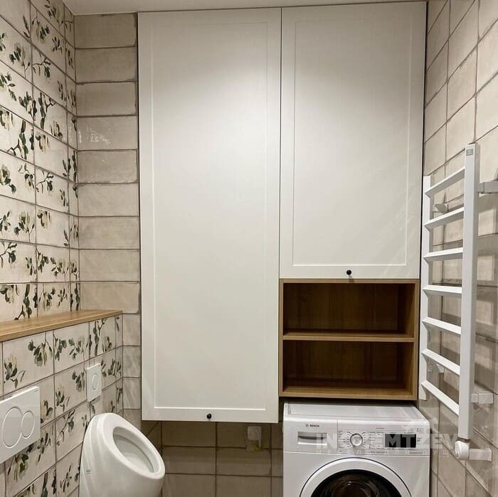 Навесной шкаф над стиральной машиной из МДФ эмали с открытыми полками из текстурного ЛДСП Egger