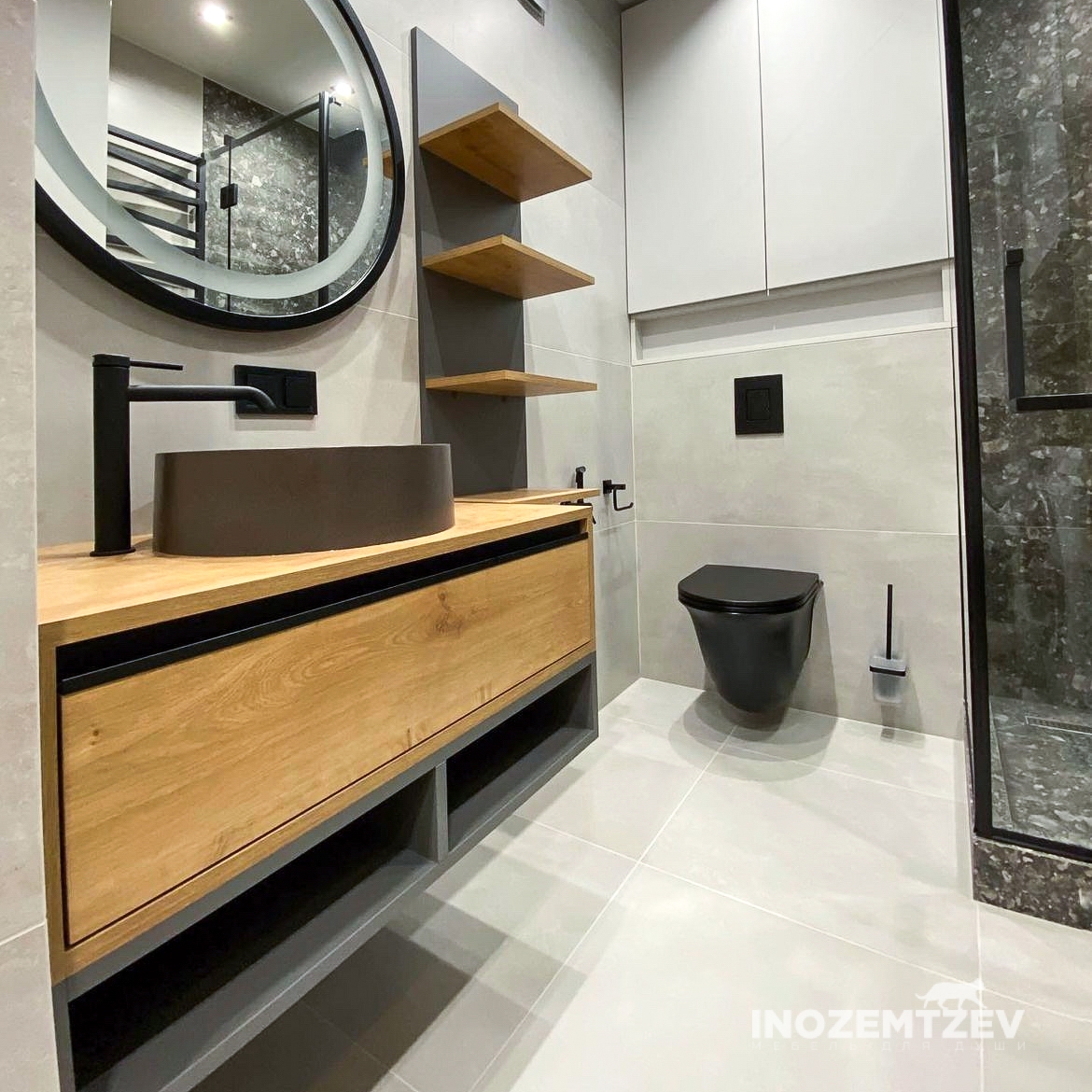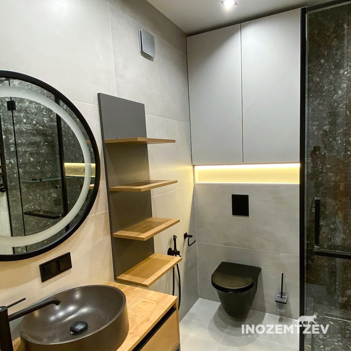 Комплект мебели в ванную комнату в современном стиле: шкаф над стиральной машиной с двумя открытыми полками, подвесная тумба, стеллаж и шкаф над инсталляцией с подсветкой