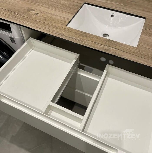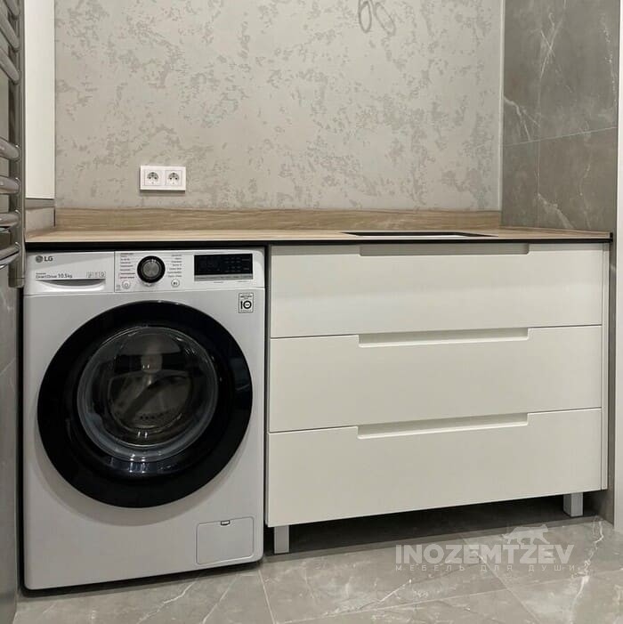Тумба под стиральную машину 140 см длиной. Столешница сделана из акрилового камня, у выдвижных ящиков - врезные металлические ручки