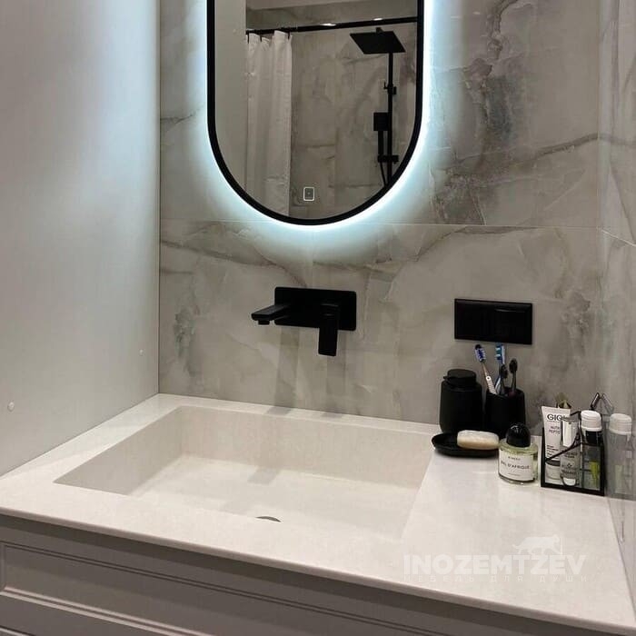 Мебель в ванную комнату с подвесной тумбой и столешницей из искусственного камня с интегрированной мойкой