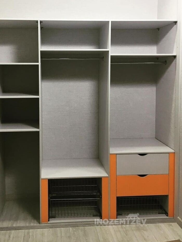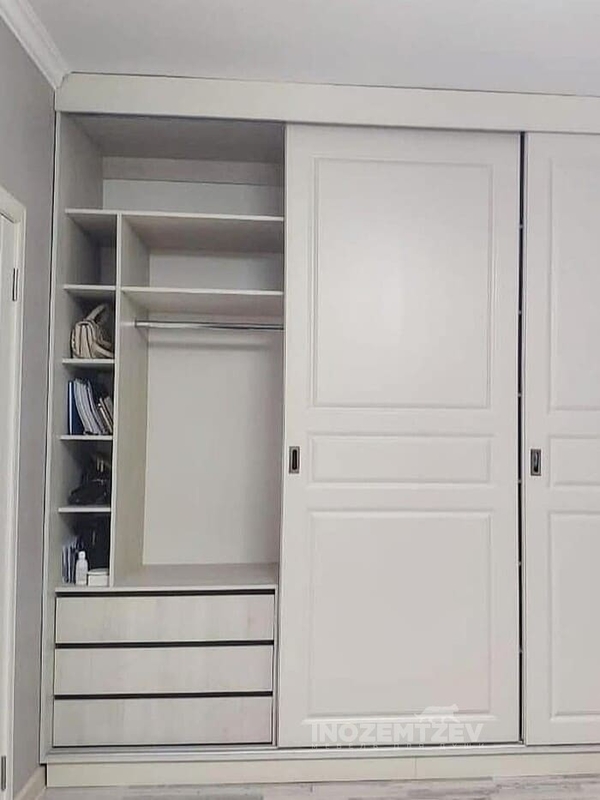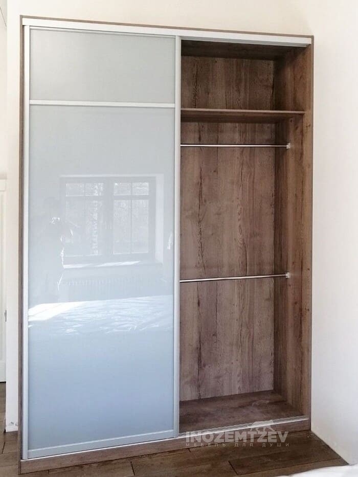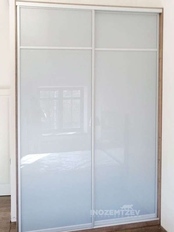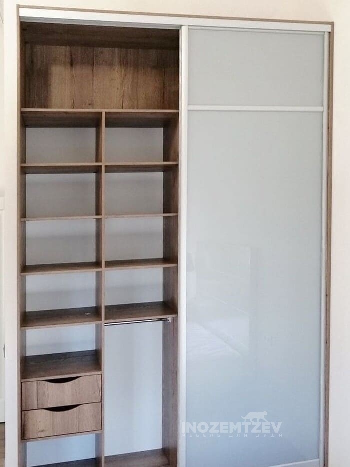 Шкаф купе с фасадами из стекла Lacobel и корпусом из ЛДСП Egger, ящики изготовлены с ручками - улыбками