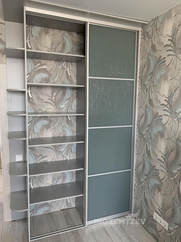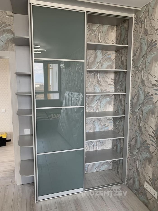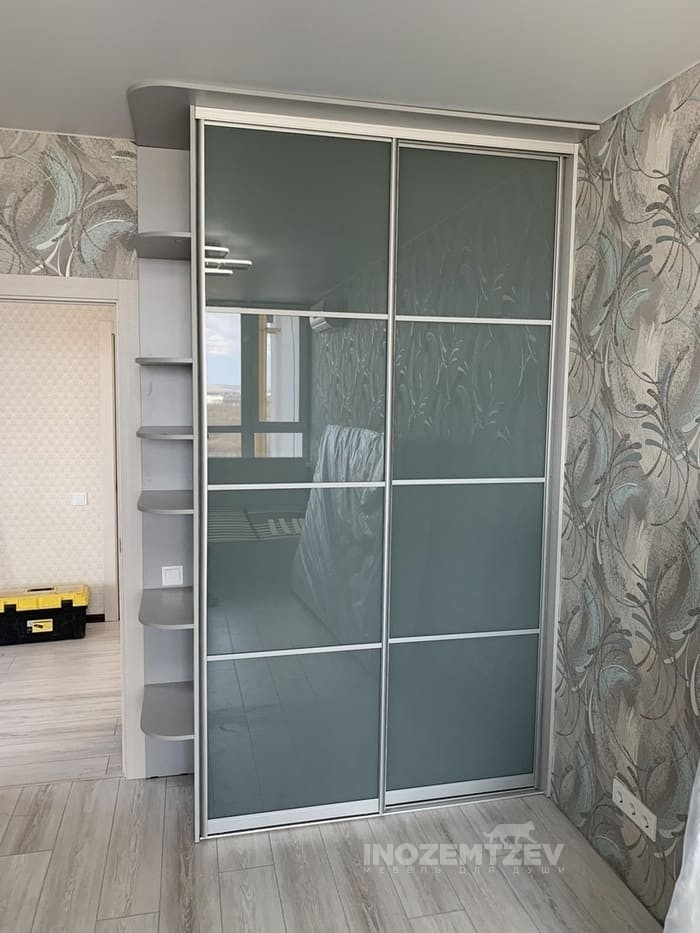 Встроенный шкаф купе с цветными стеклянными фасадами Lacobel и боковыми радиусными открытыми полками