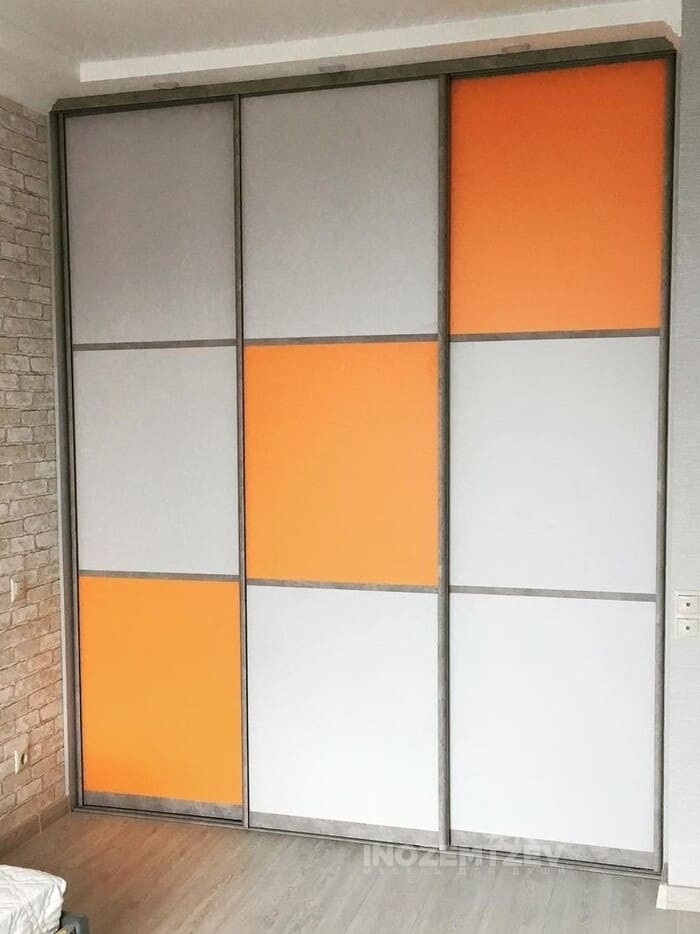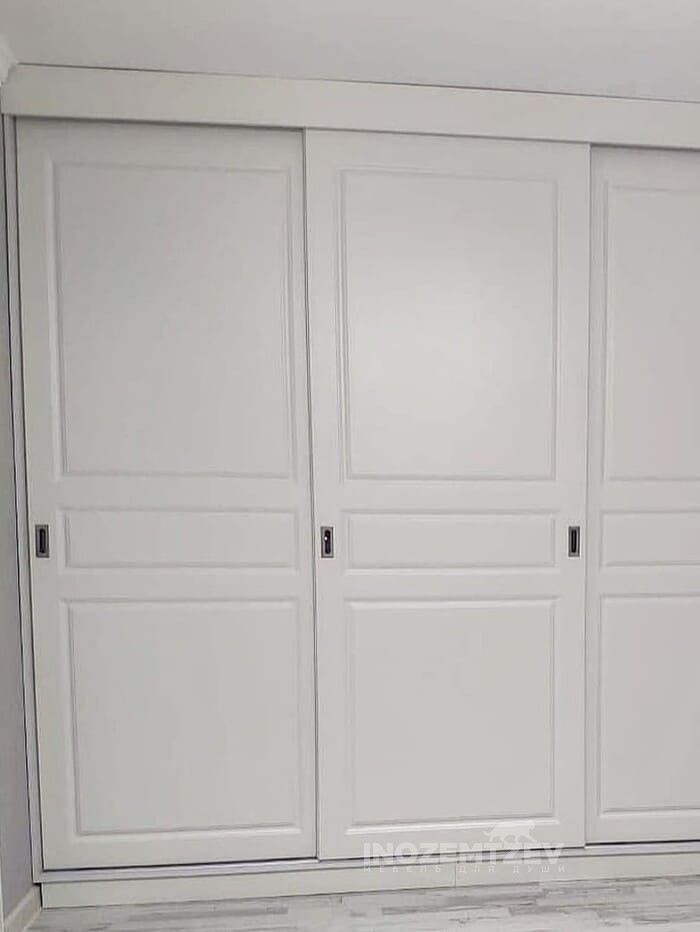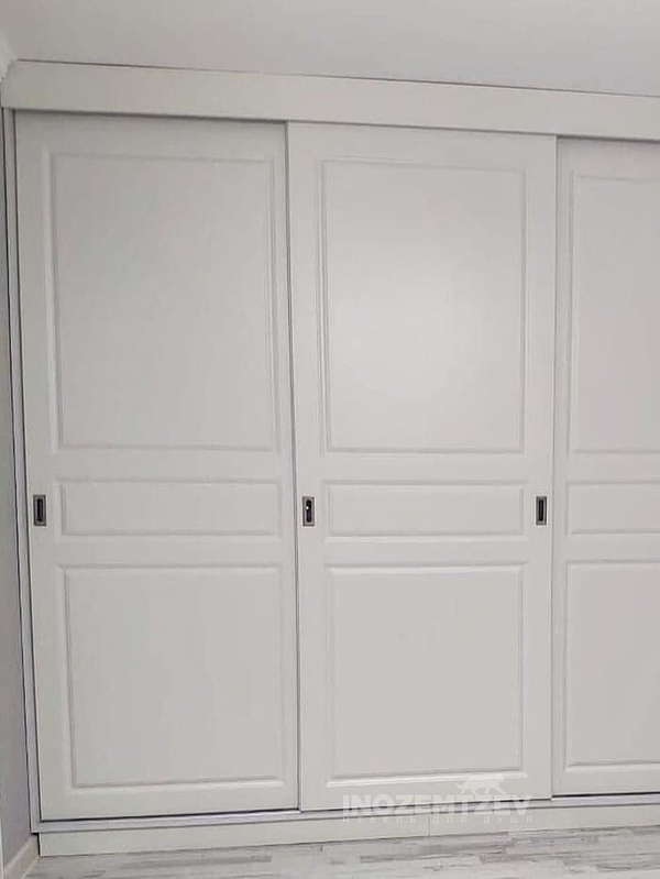 Трехствочратый шкаф купе из МДФ эмали с фрезерованными фасадами и врезными ручками
