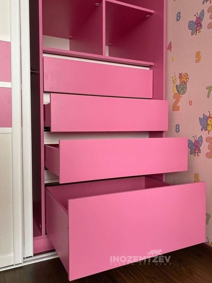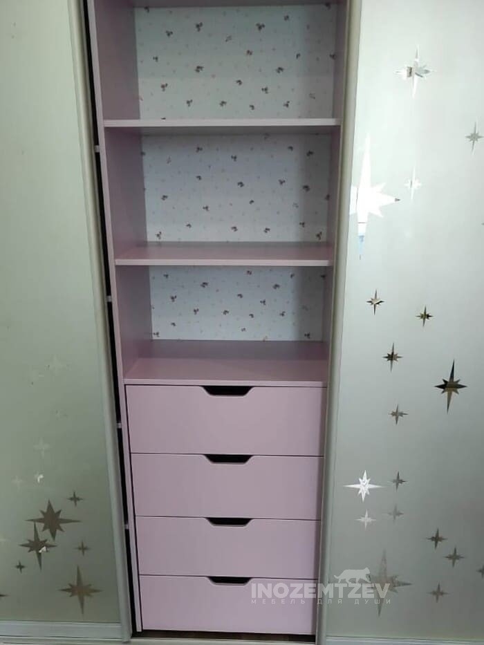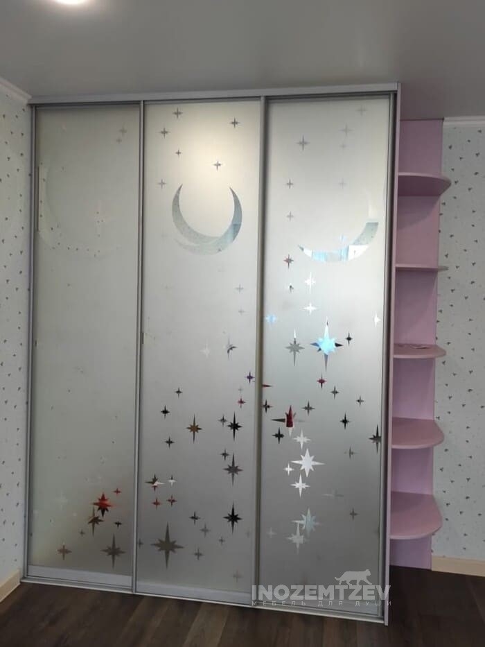 Встроенный шкаф купе с пескоструйным рисунком и радиусными полками в комнату девочки