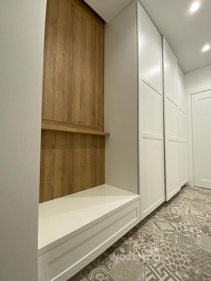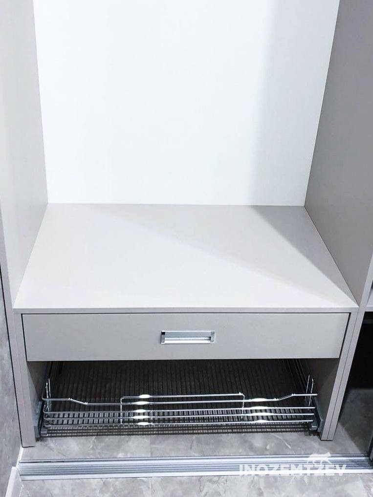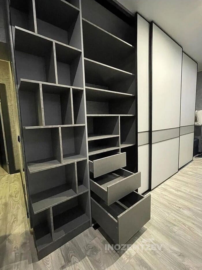 Встроенный шкаф купе в нише в прихожей с восемью выдвижными ящиками и большим пространством для плечиков
