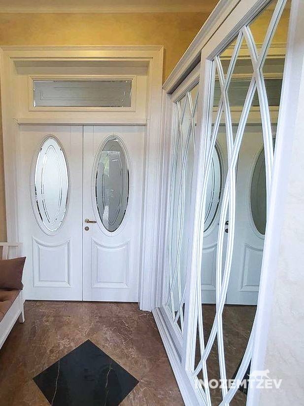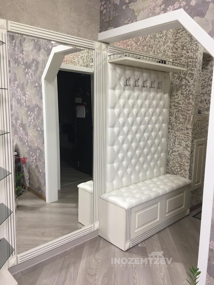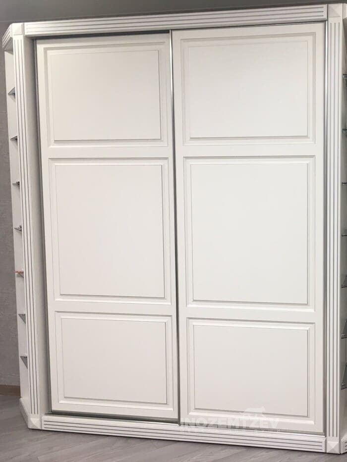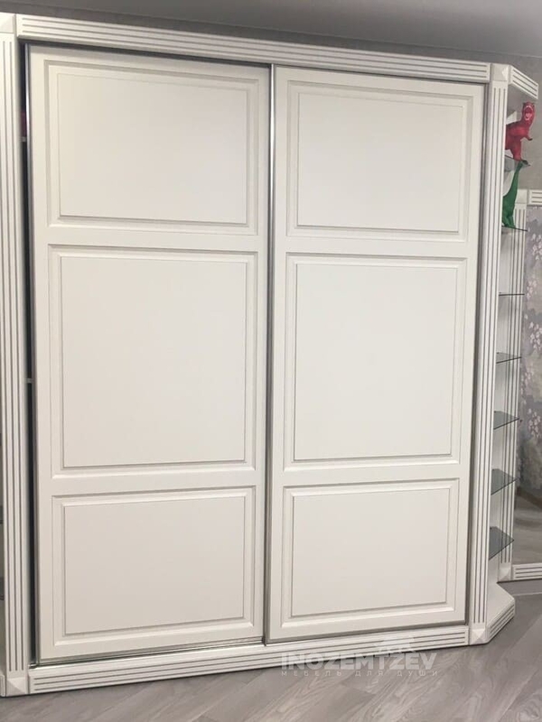 Зеркальный шкаф купе в белом цвете в стиле неоклассика в коридор