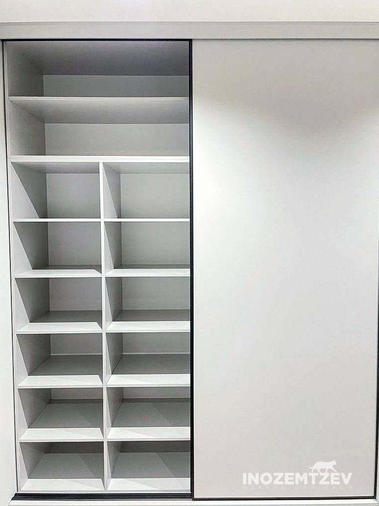 Шкаф купе с обувницей в прихожую с фрезерованными фасадами и пилястрами по периметру