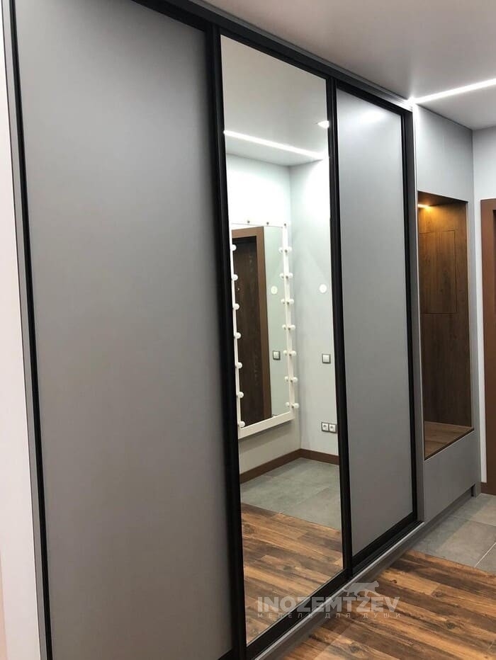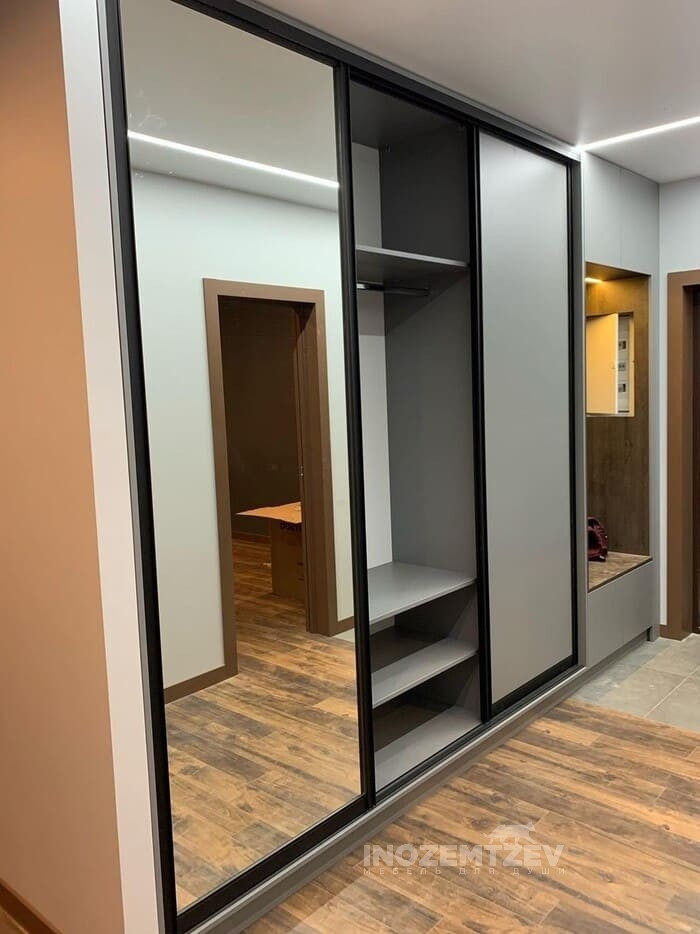 Шкаф купе в прихожую в современном стиле с тонким профилем Slim и зеркалом цвета графит