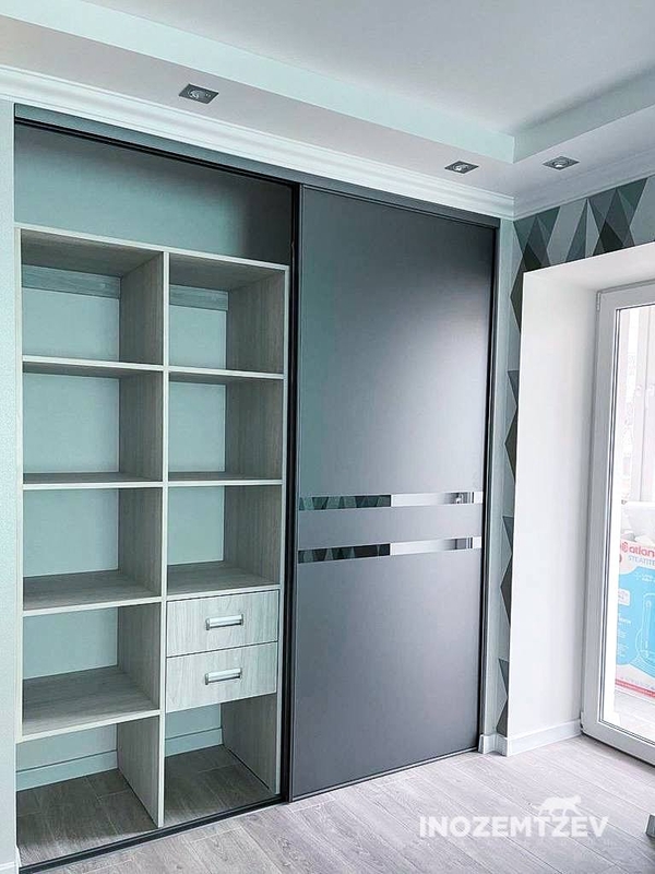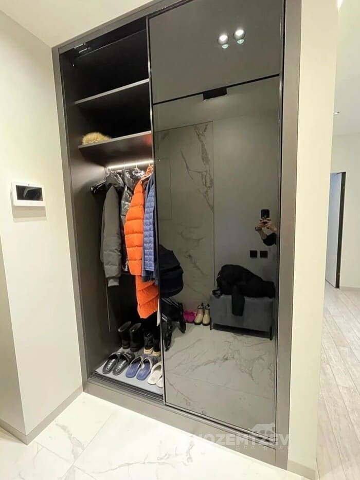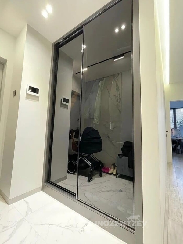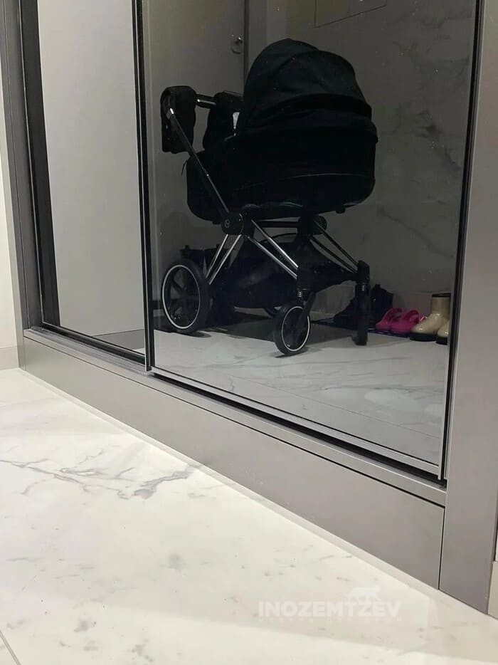 Шкаф купе в прихожую, встроенный в нишу, со скрытой дверцей для электрощитовой. Фасады шкафа выполнены из двух видов зеркал: обычное и сатин; в алюминиевом профиле