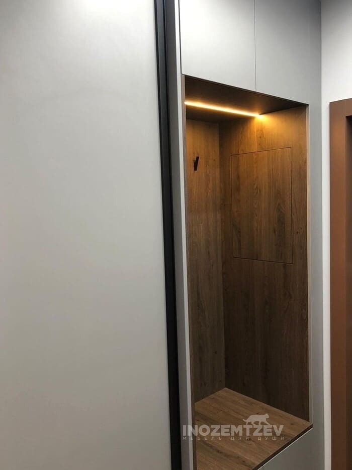 Прихожая в современном стиле с двухдверным шкафом купе, встроенным в нишу, с подсветкой