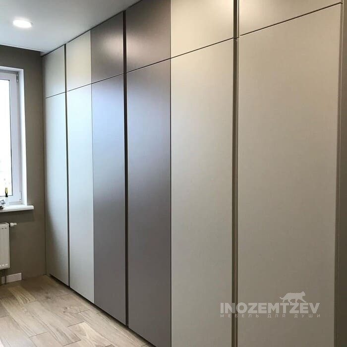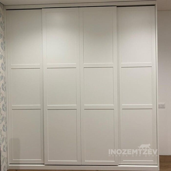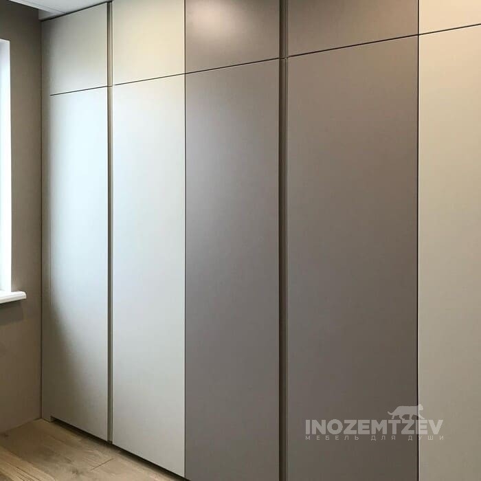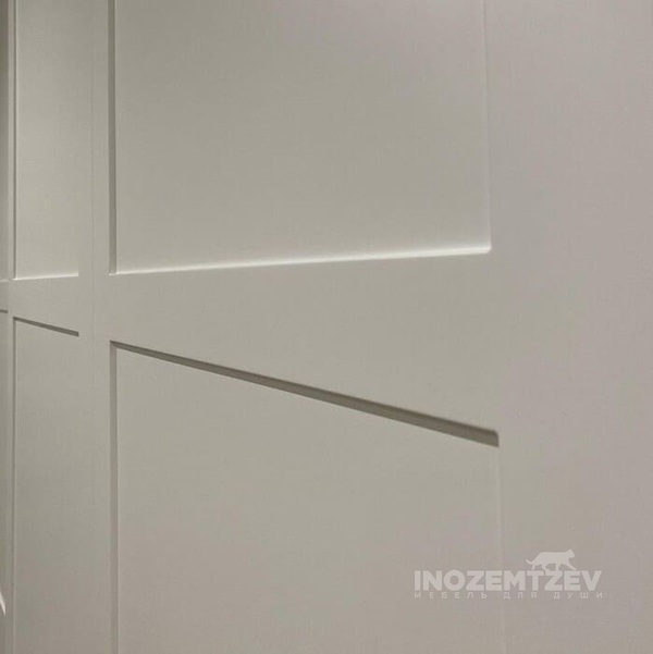 Шкаф 4 дверный в спальню из МДФ эмали с пилястрами и врезными ручками цвета бронза
