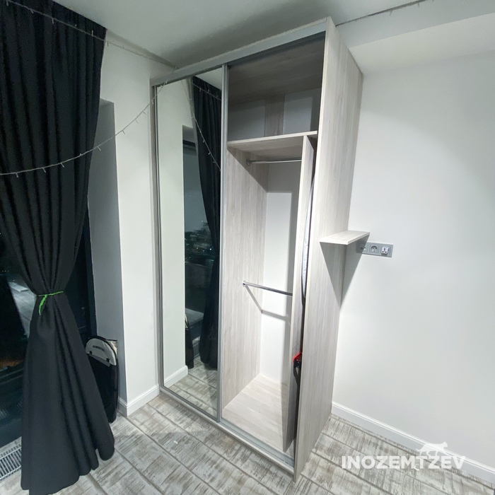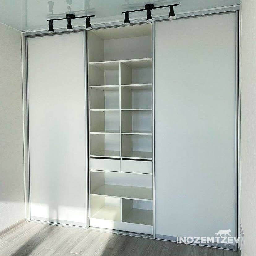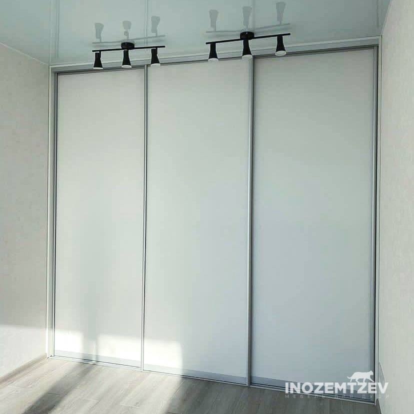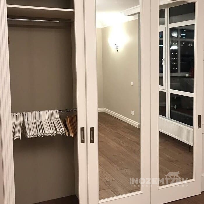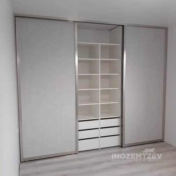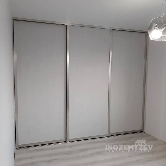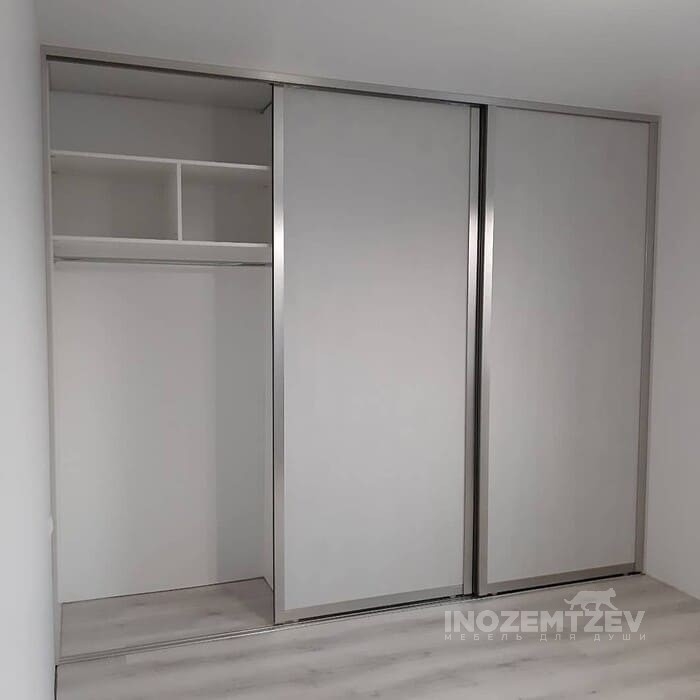 Встроенный шкаф купе для одежды на заказ из алюминиевого хромированного профиля и ЛДСП