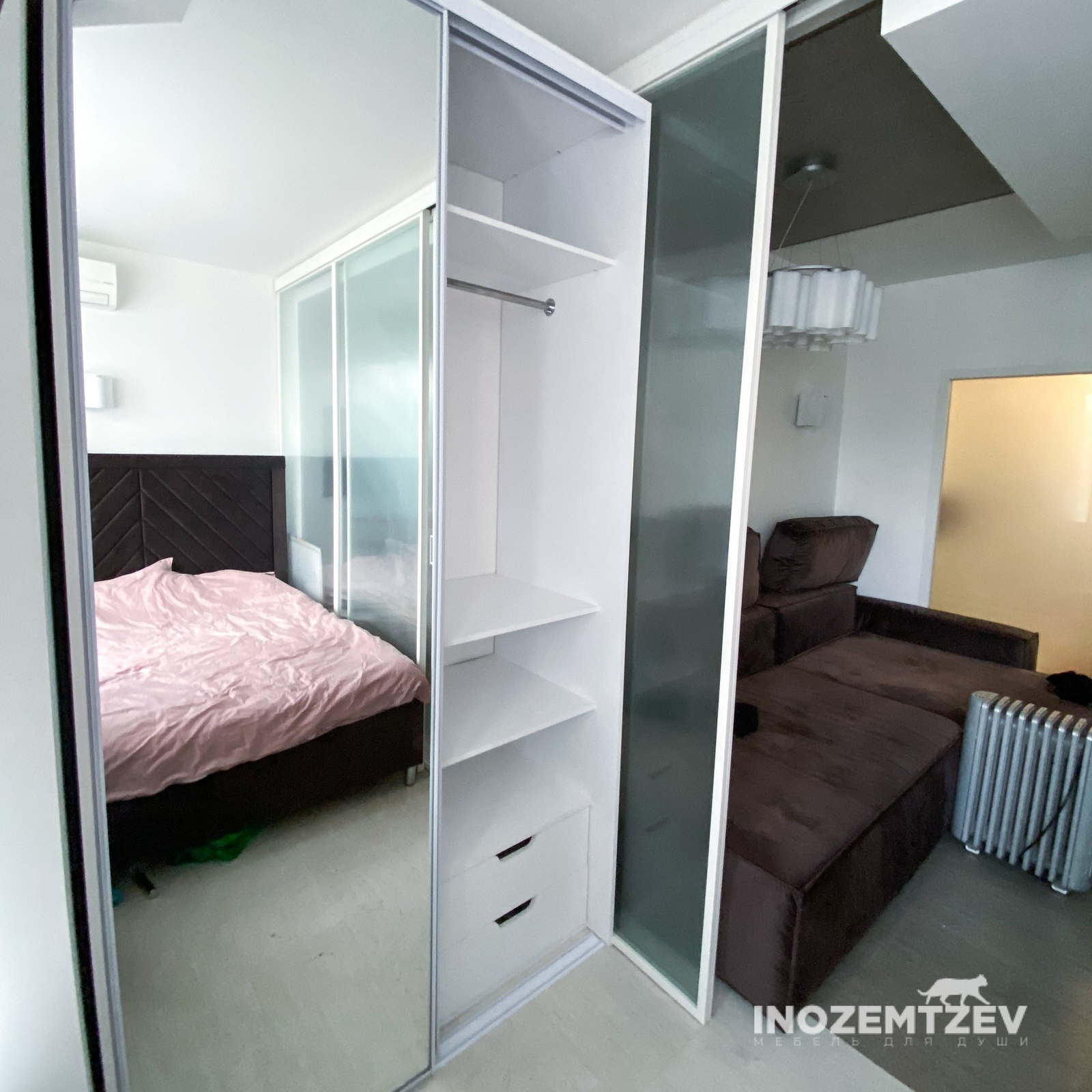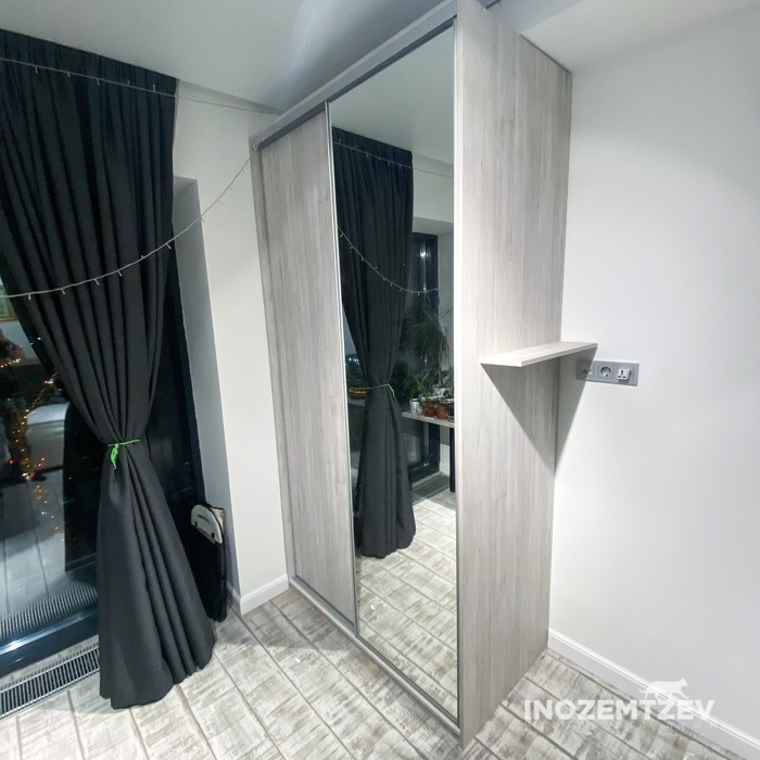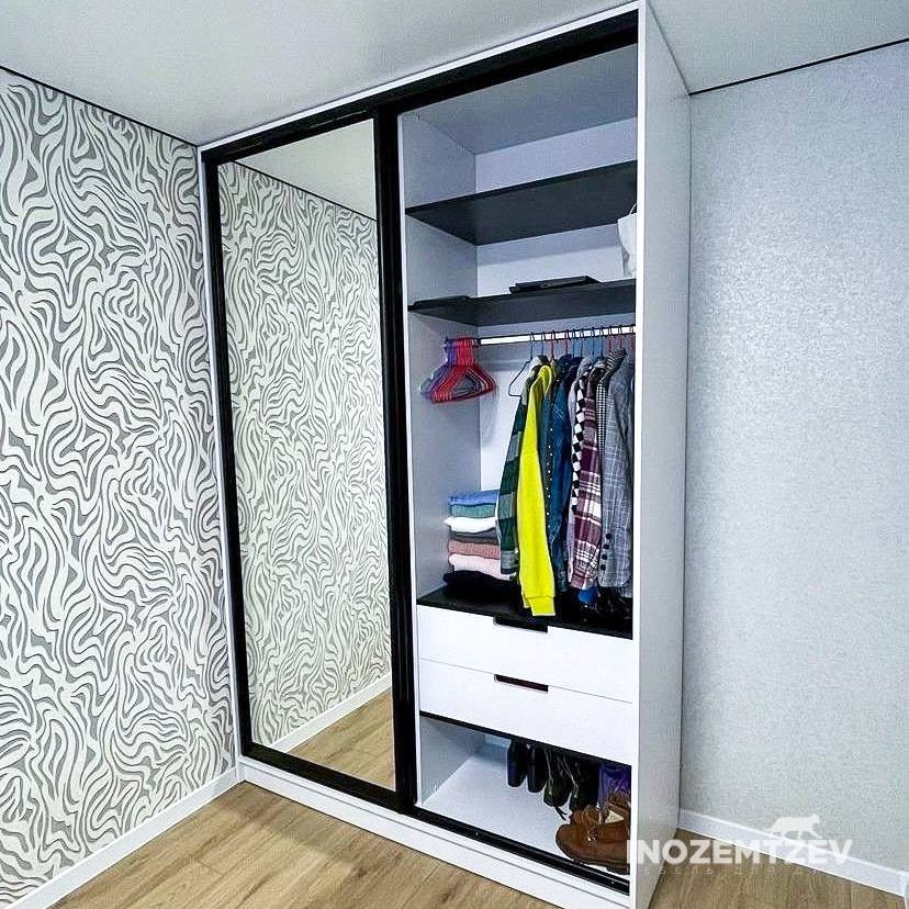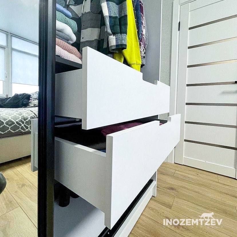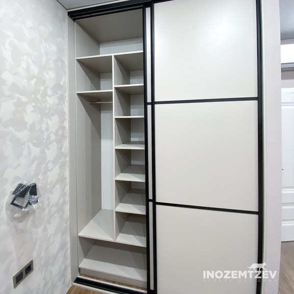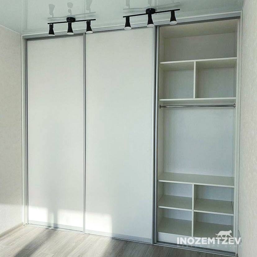 Встроенный шкаф купе для одежды на заказ из алюминиевого хромированного профиля и ЛДСП