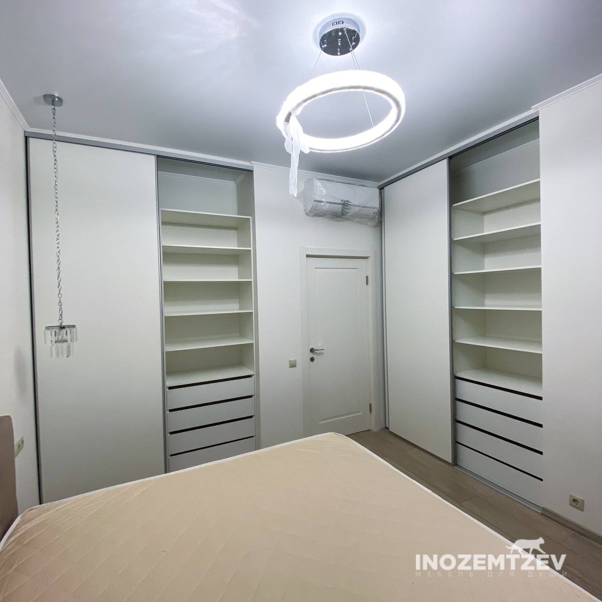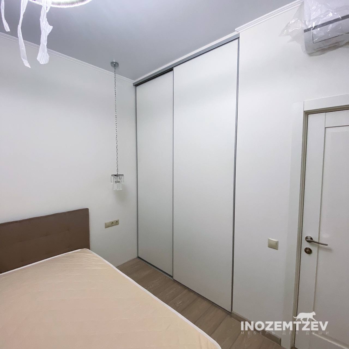 Два шкафа купе в спальную комнату. Размеры левого: 2883х1736х600 мм. Размеры правого: 2884х1716х600 мм. Материал: ЛДСП Egger Белый платиновый, направляющие скрытого монтажа