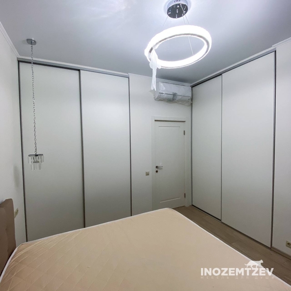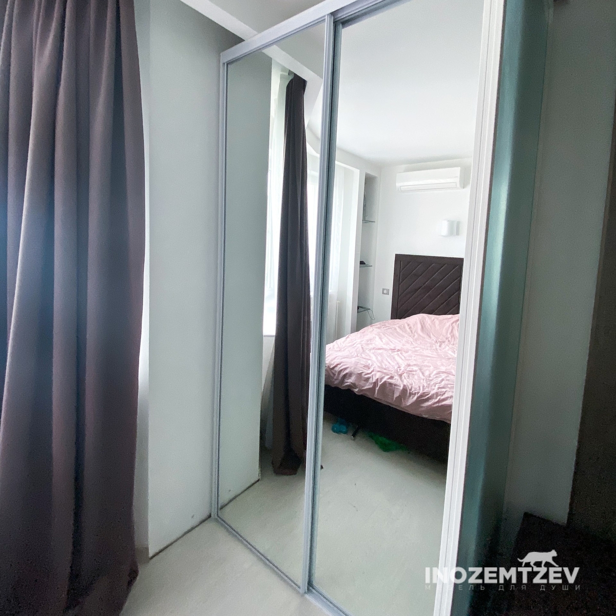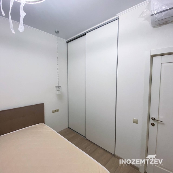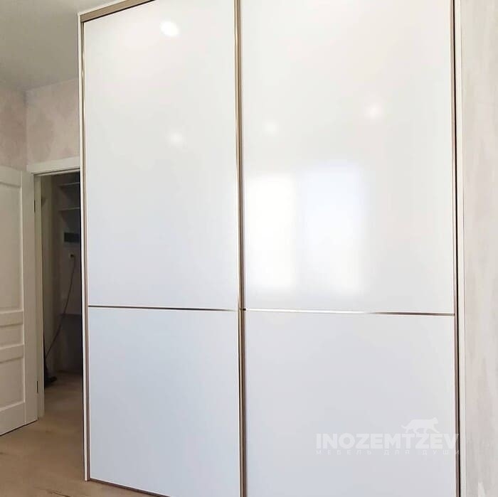 Встроенный шкаф купе в маленькую спальню с глянцевыми фасадами, створки в алюминиевом профиле в цвете матовое золото