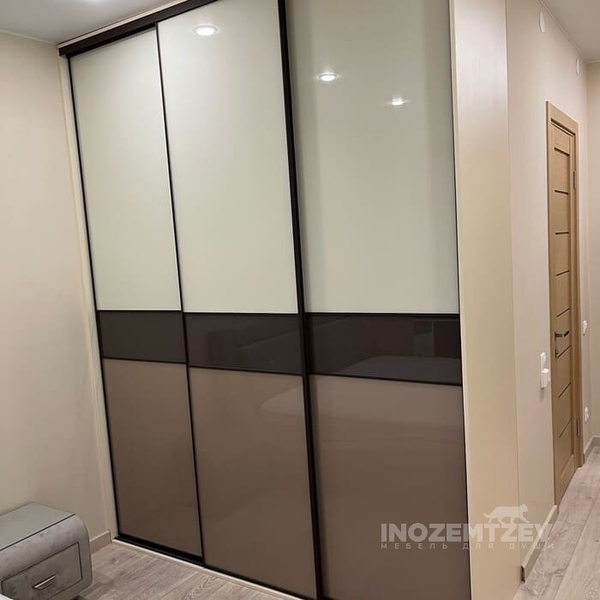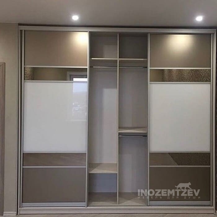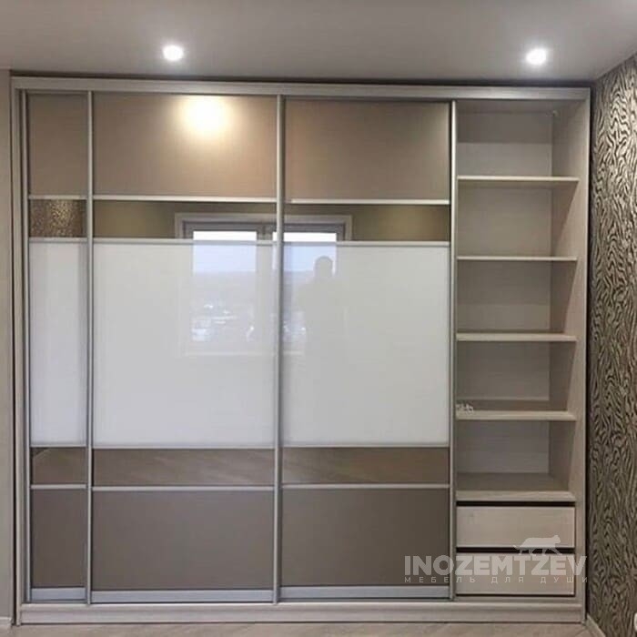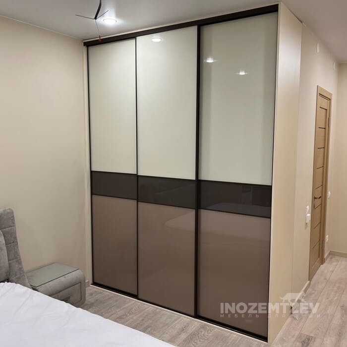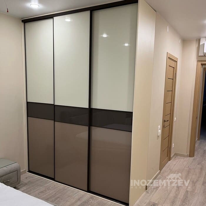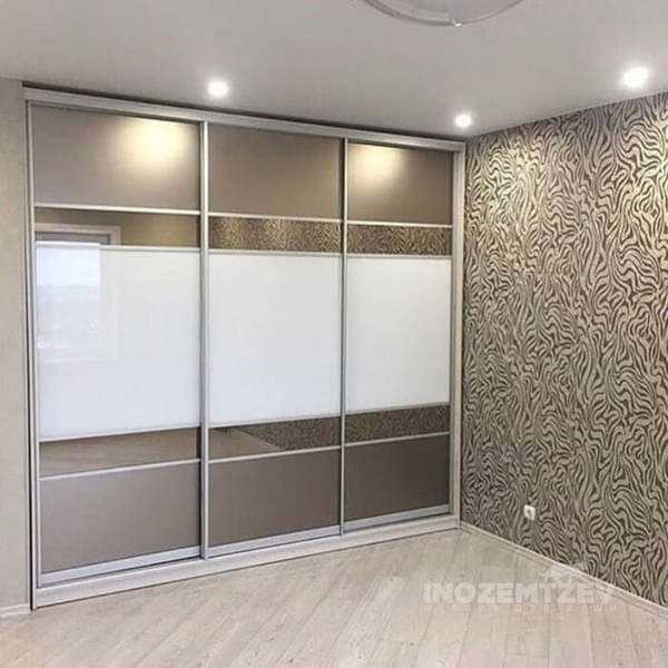 Раздвижной шкаф в спальню с вставками из цветного стекла Lacobel, зеркала матового и зеркала золото