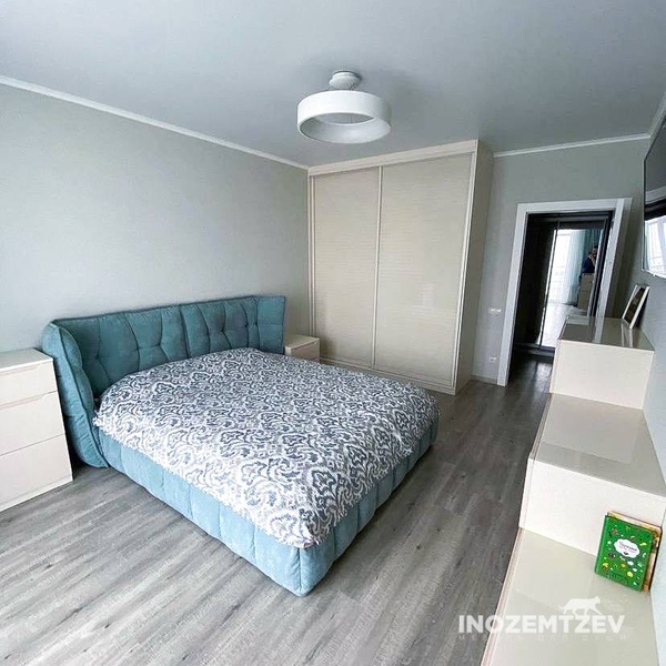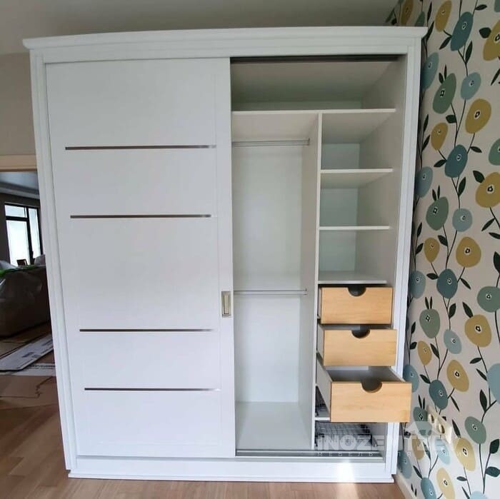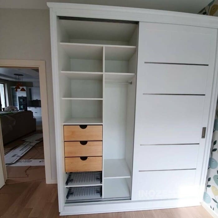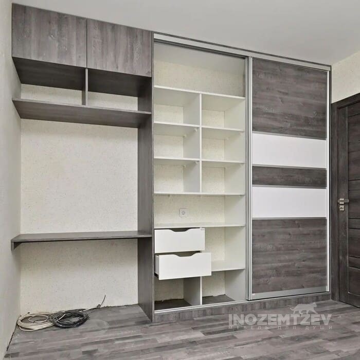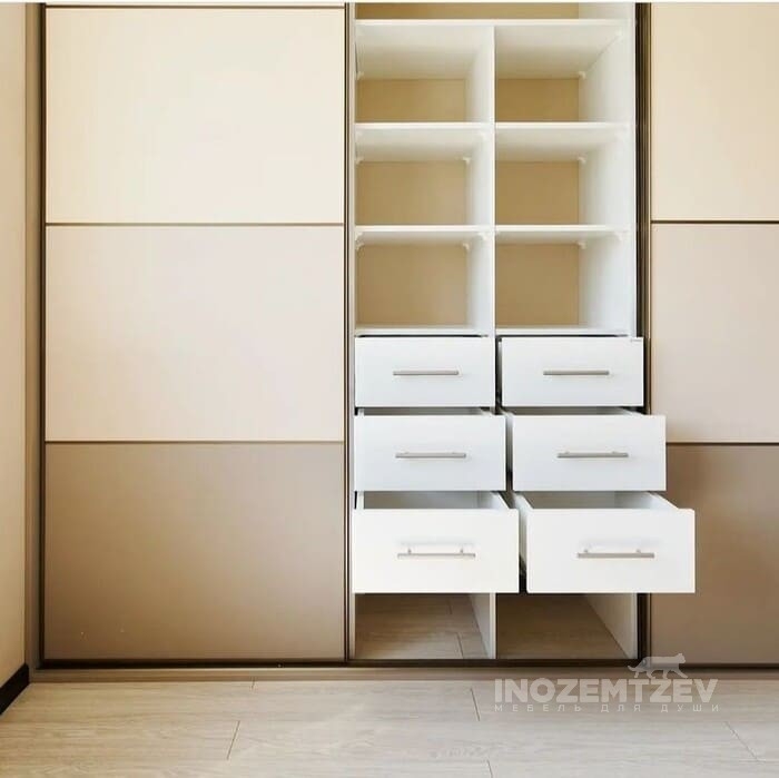 Стильный шкаф купе трехстворчатый без зеркала с выдвижными ящиками в спальную комнату
