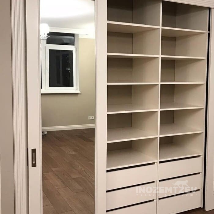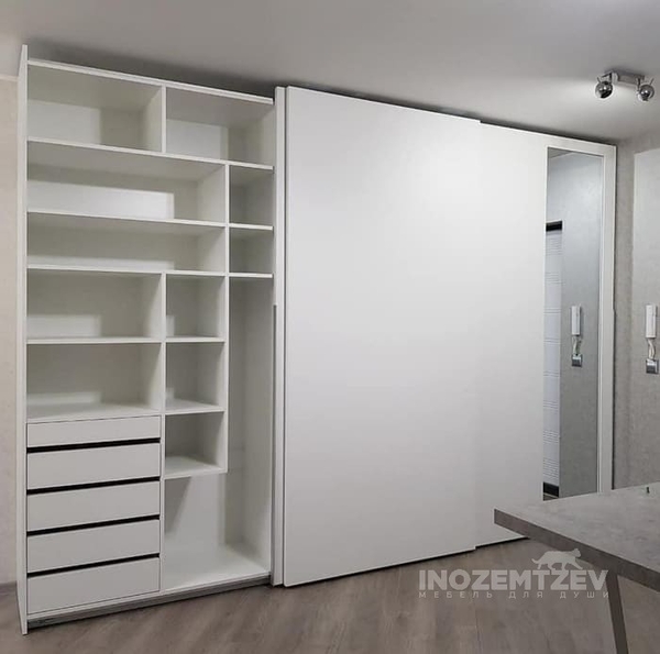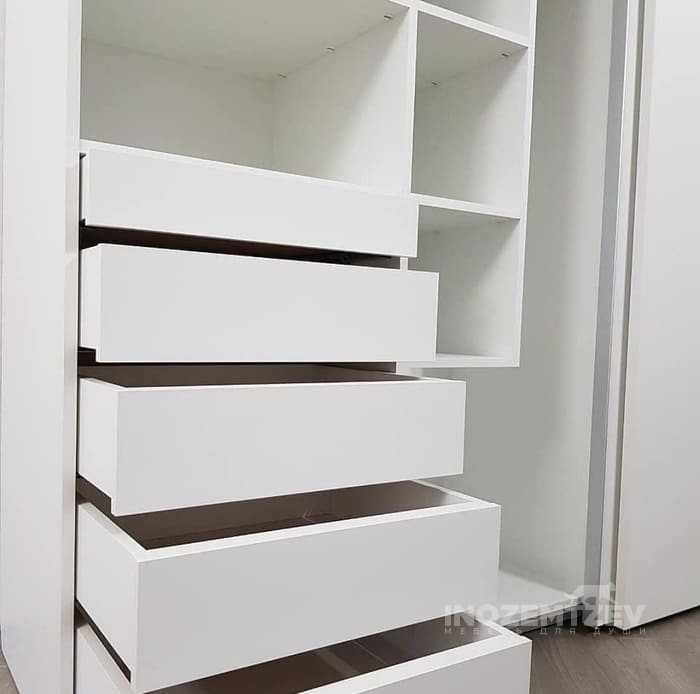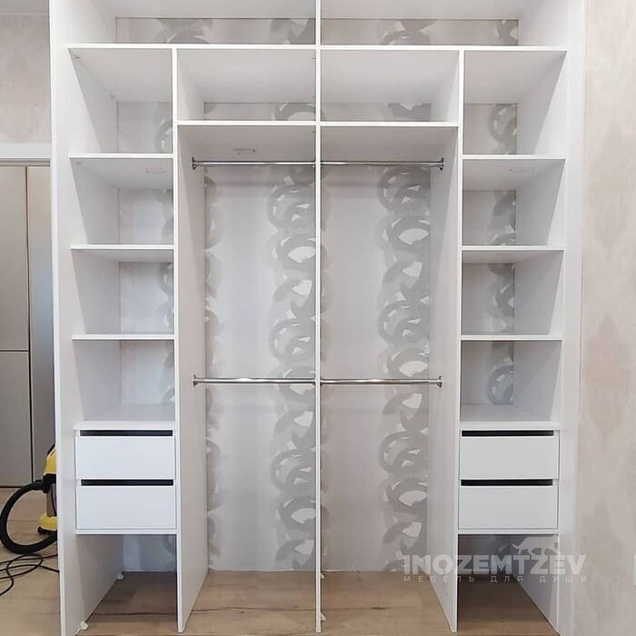Белый шкаф купе в спальню из рамочного крашенного МДФ, наполнение: полки, выдвижные ящики, штанги