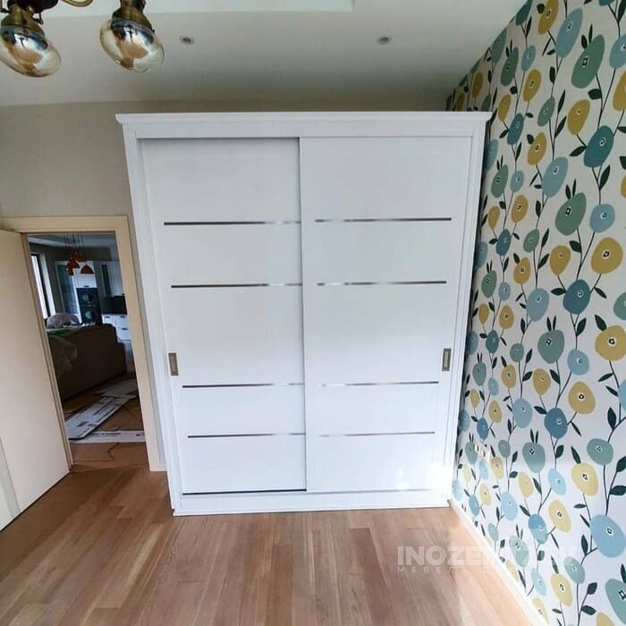 Двухстворчатый шкаф купе в спальню из МДФ с металлизированными молдингами и врезными ручками