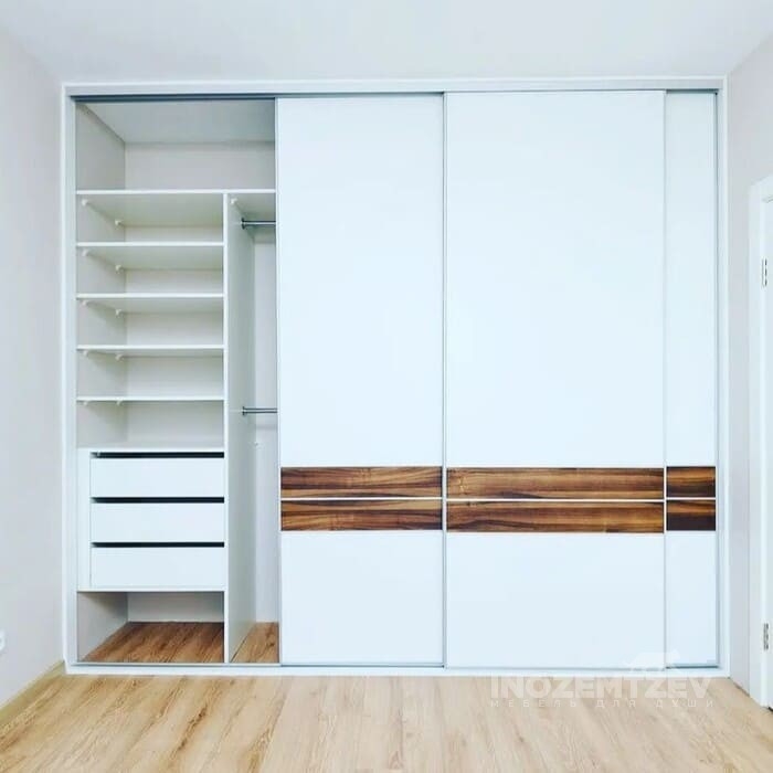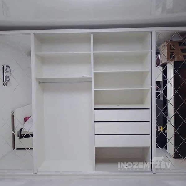Шкаф в спальню с раздвижными дверями с зеркальными вставками, наполнение: выдвижные ящики, полки, штанга
