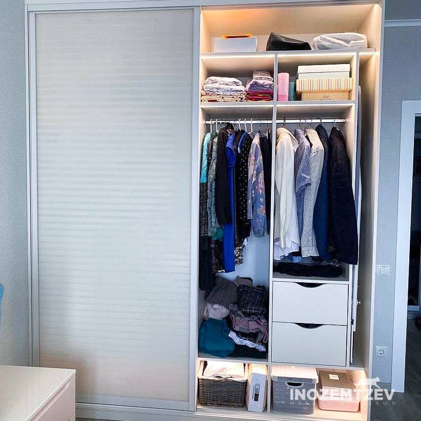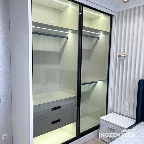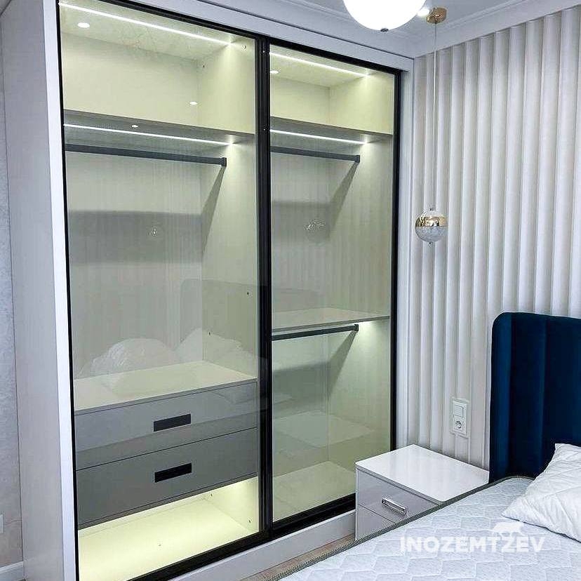 Стильный шкаф купе в спальню на заказ с подсветкой и стеклянными прозрачными дверями