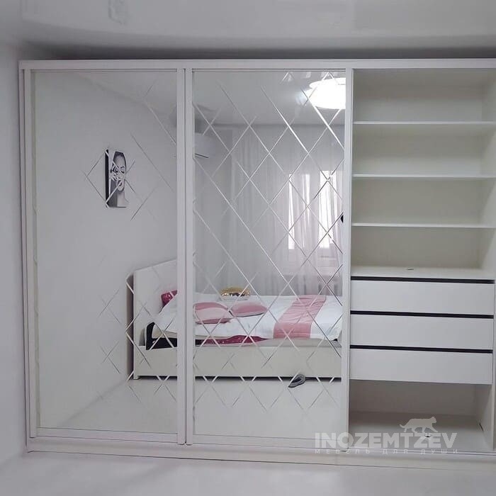 Шкаф купе для одежды в спальню зеркальный с лазерной гравировкой, пантографом и выдвижными ящиками