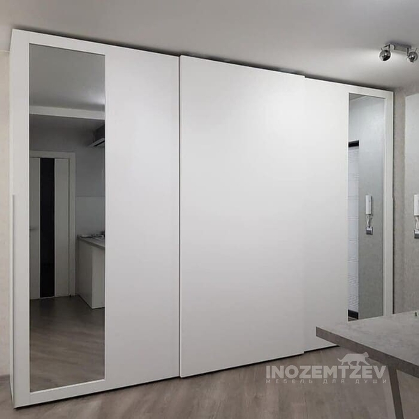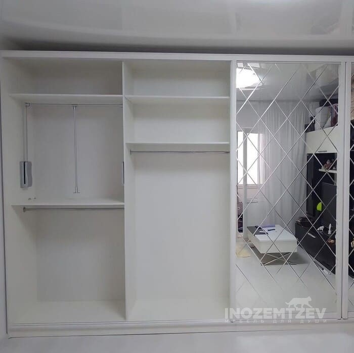 Белый шкаф с зеркалом в спальню, корпус выполнен из ЛДСП Egger Белый альпийский. Размеры: 2510x1295 мм