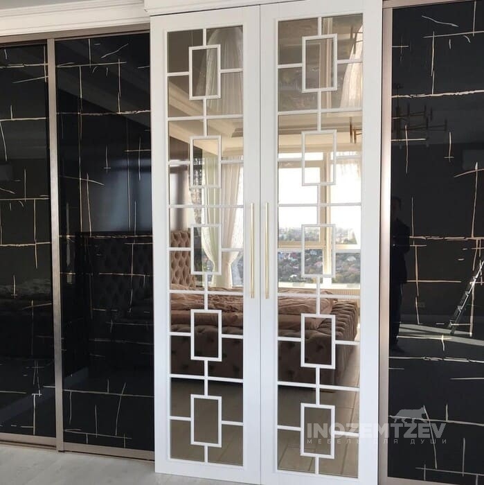 Комбинированный большой шкаф купе в спальню с распашными дверями с двумя видами зеркал: зеркало бронза с МДФ раскладкой и декоративное зеркало, корпус - ЛДСП