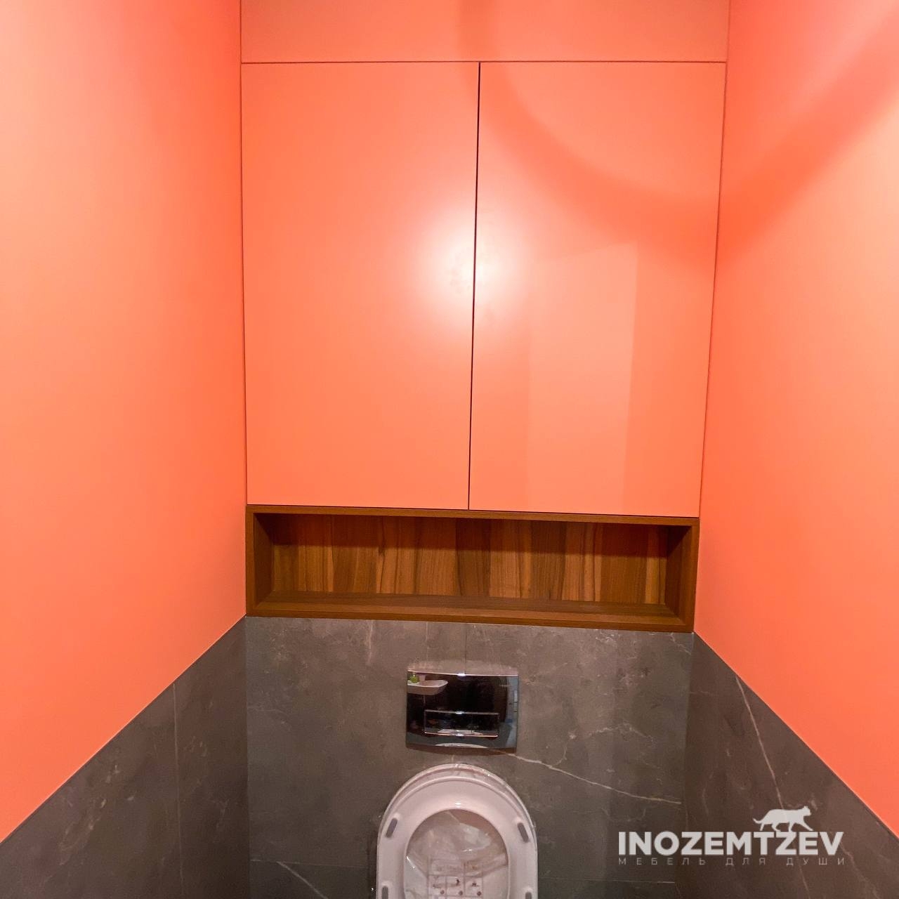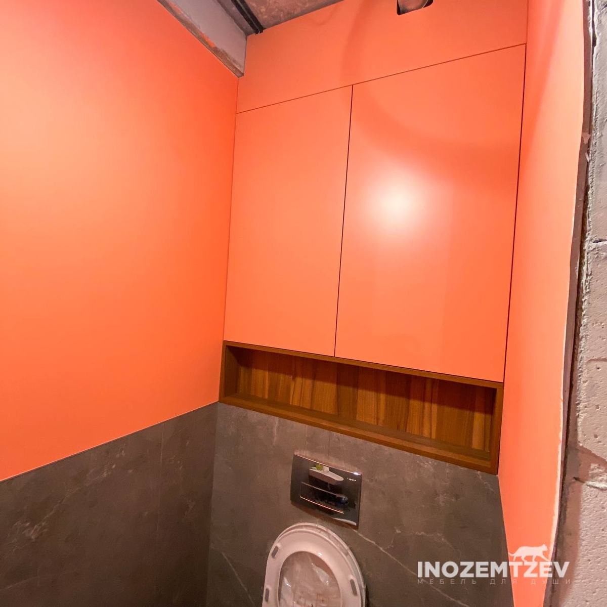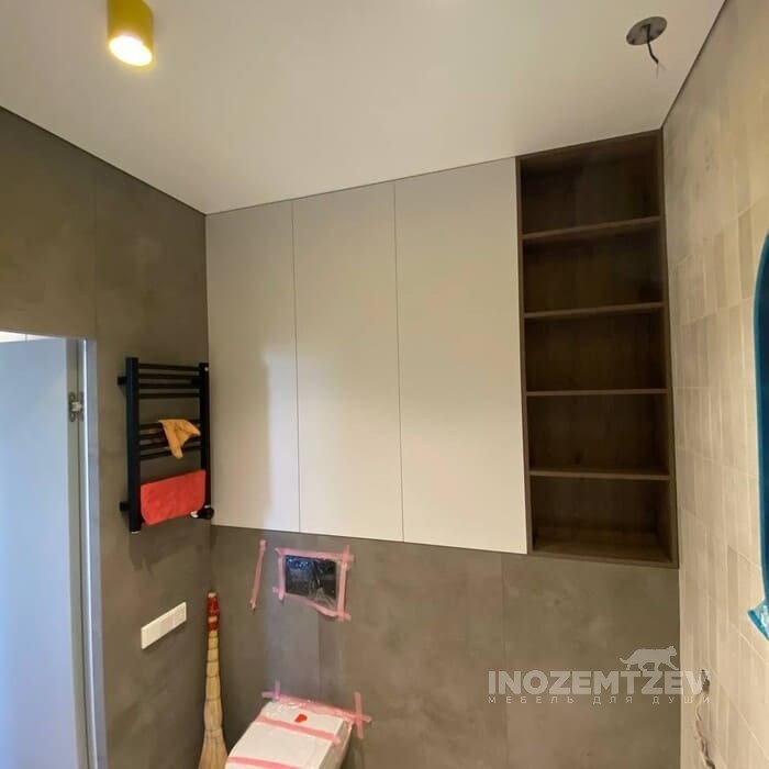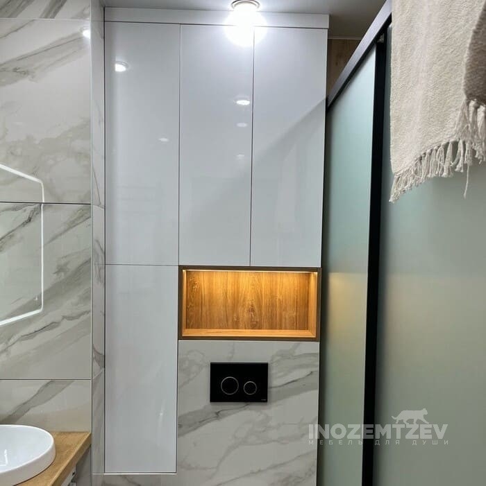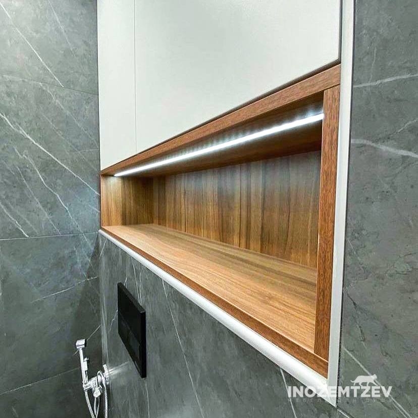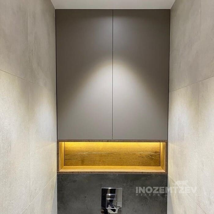 Стильный шкаф над инсталляцией в туалете с открытой полкой и подсветкой