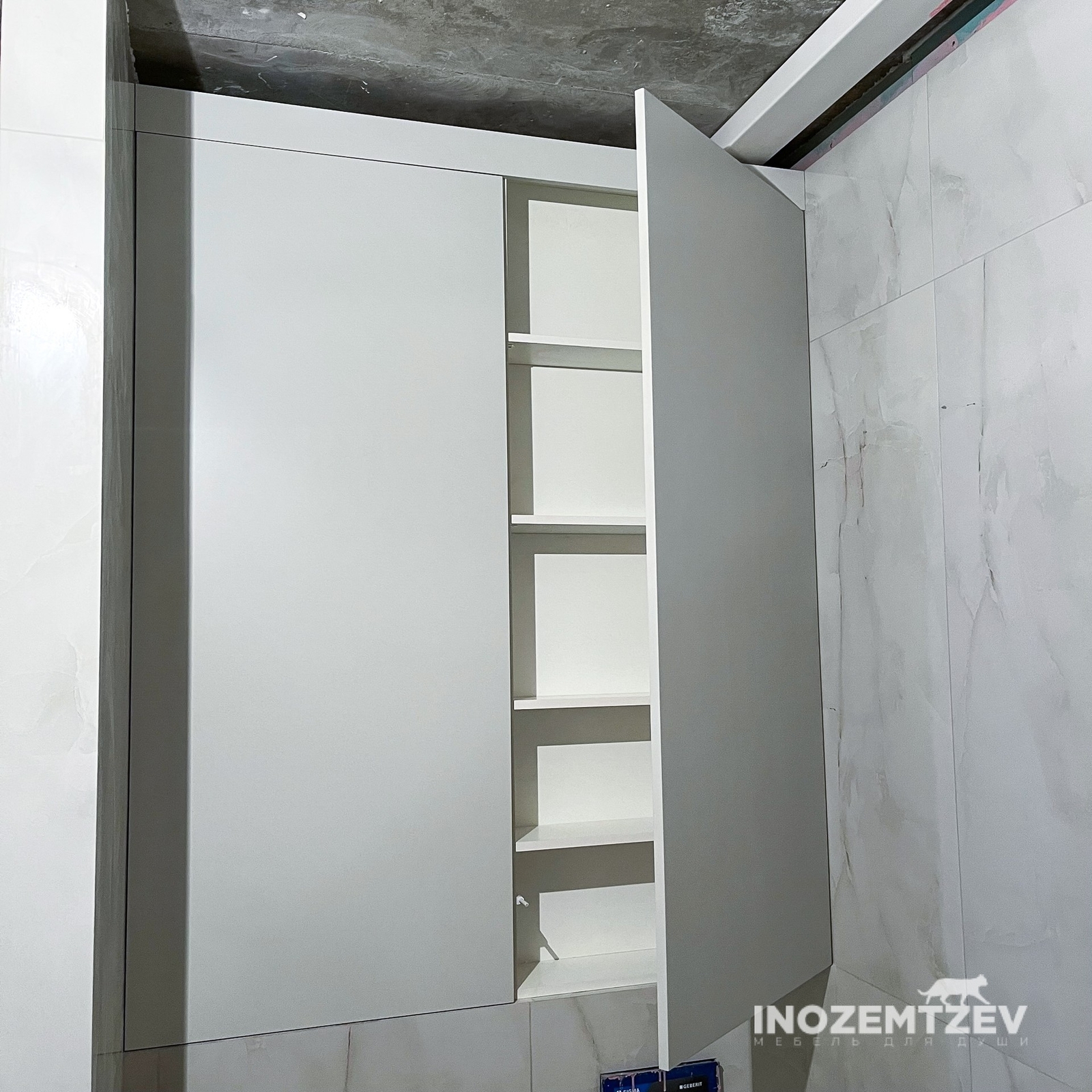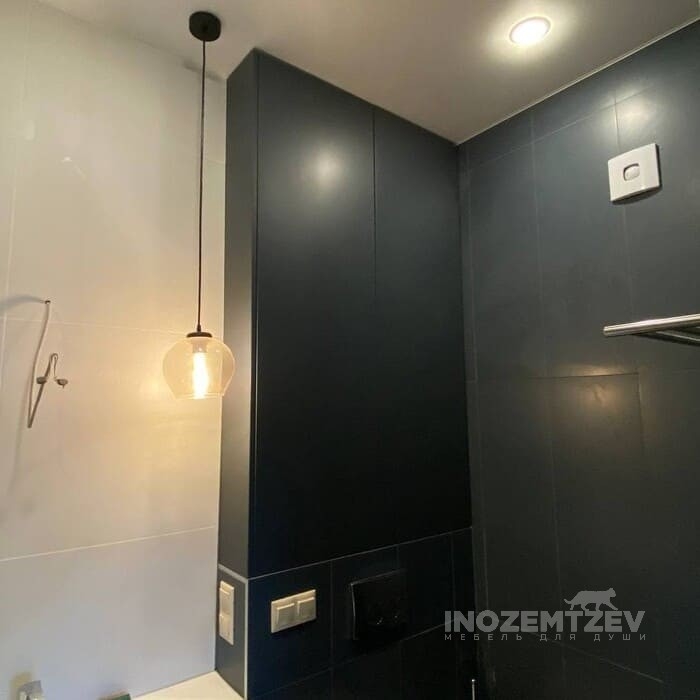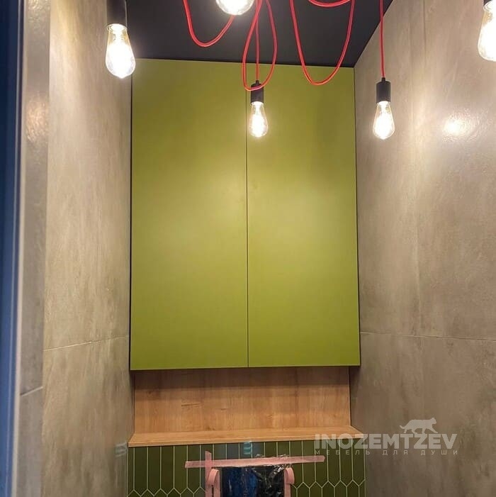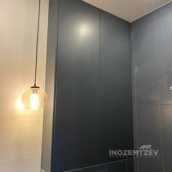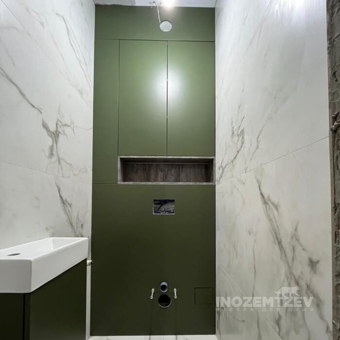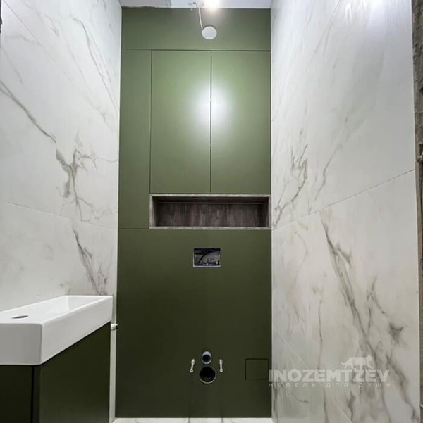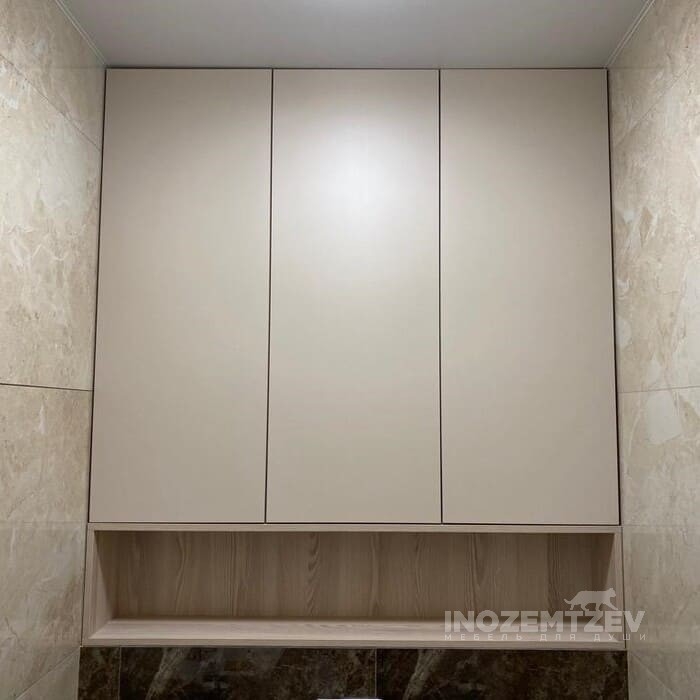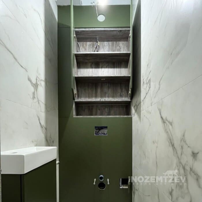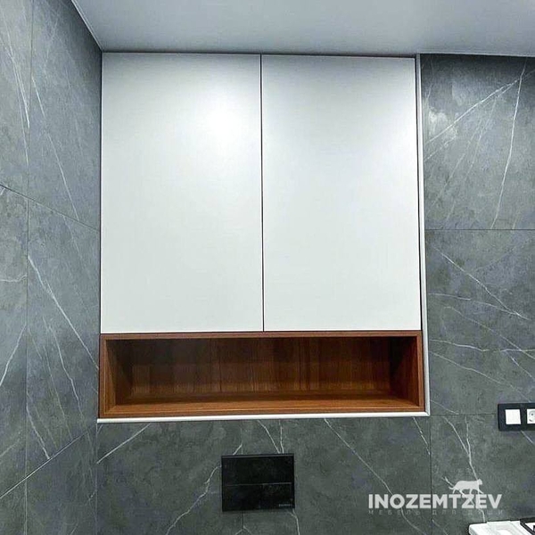 Распашной шкафчик над инсталляцией в цвет плитки с системой открывания push-to-open, может быть изготовлен как из МДФ, так и из ЛДСП Egger