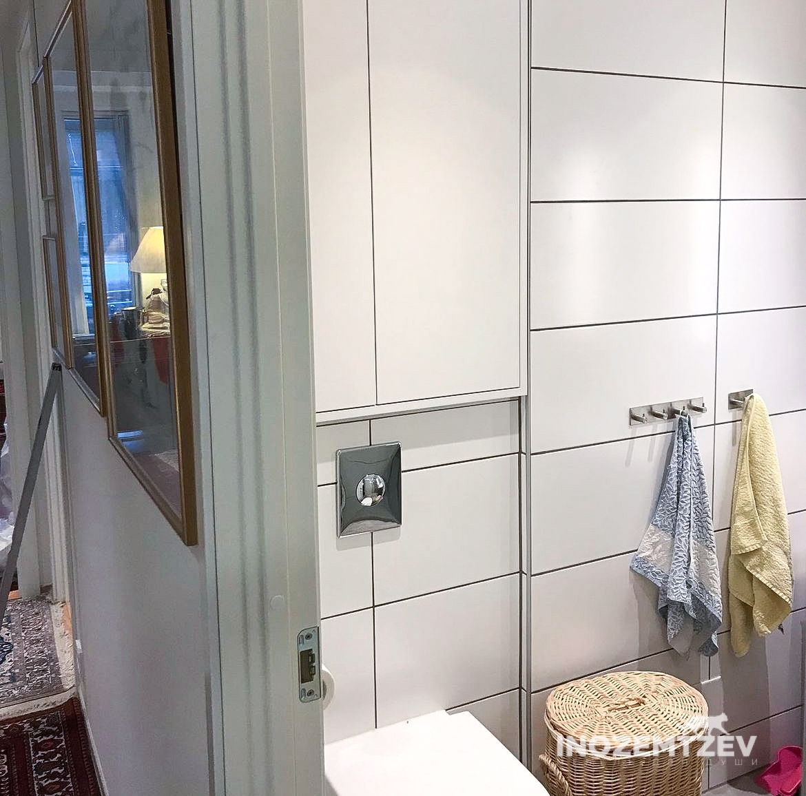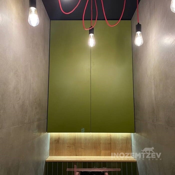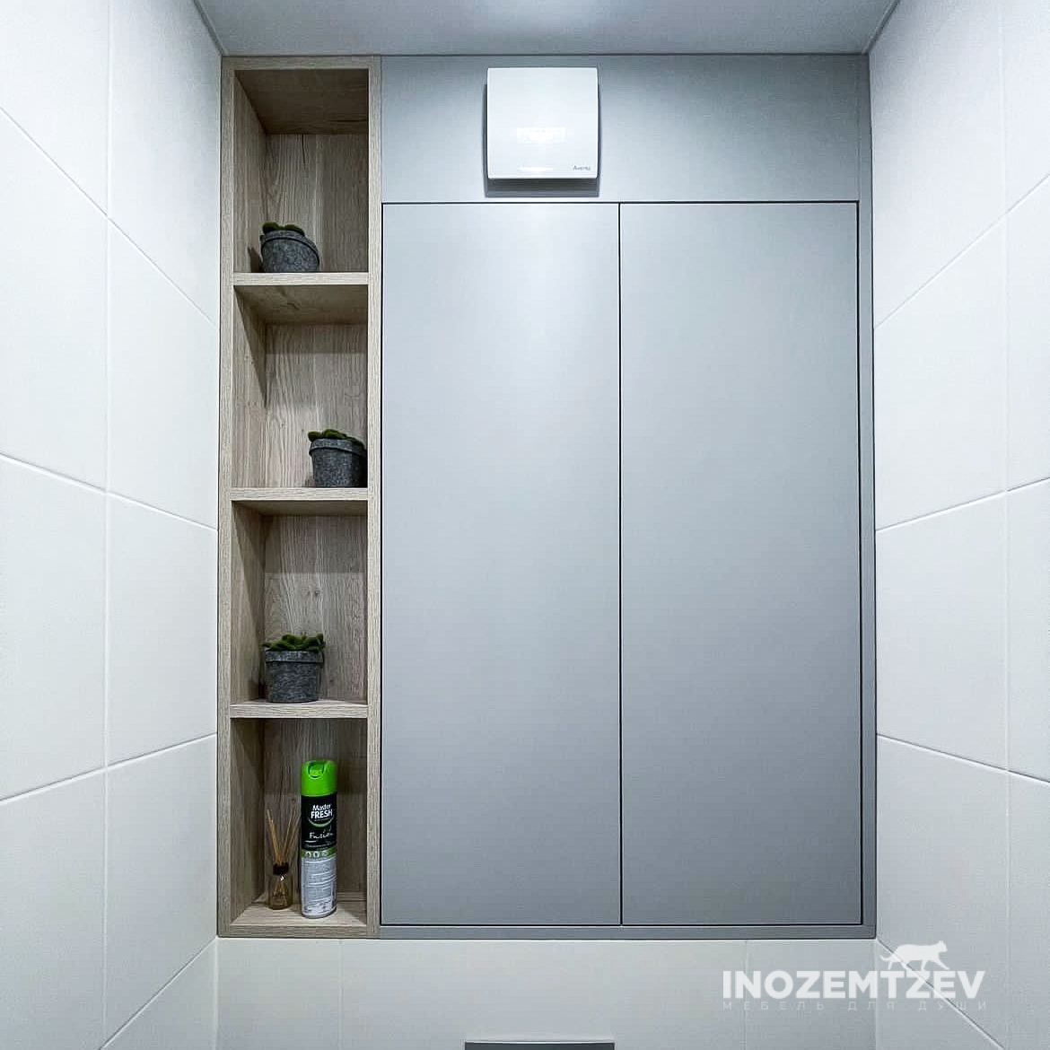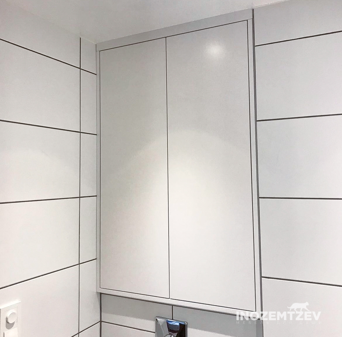 Распашной шкафчик над инсталляцией в цвет плитки с системой открывания push-to-open, может быть изготовлен как из МДФ, так и из ЛДСП Egger
