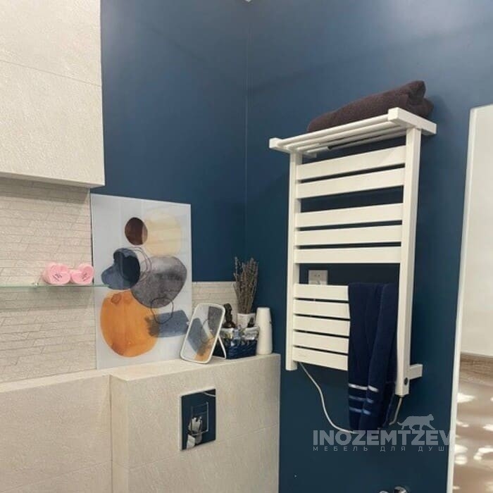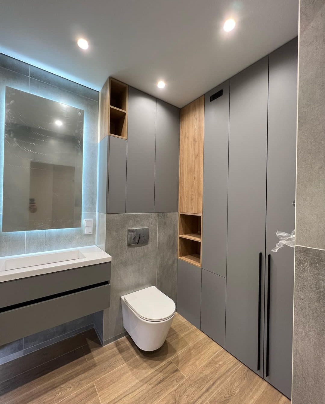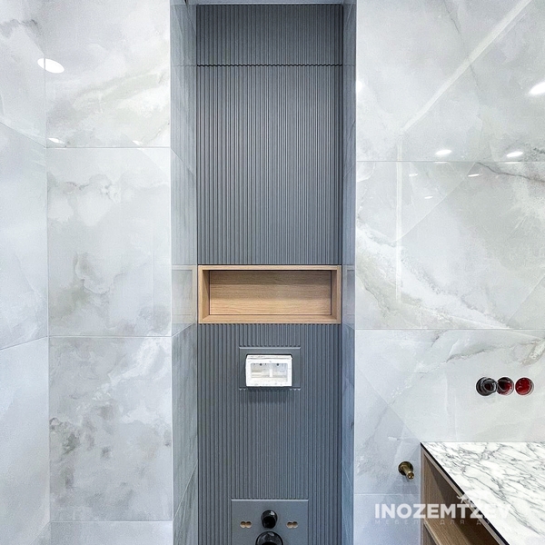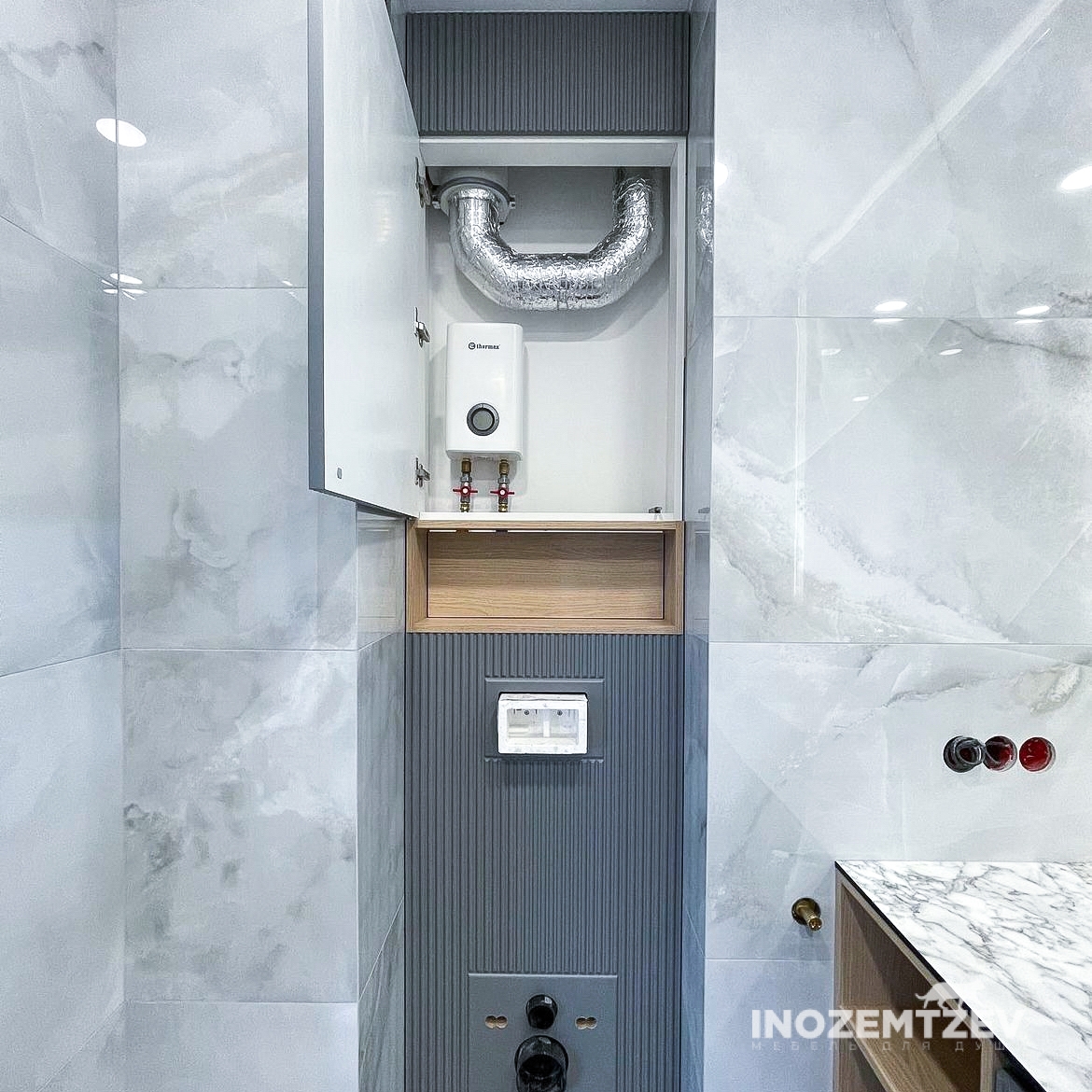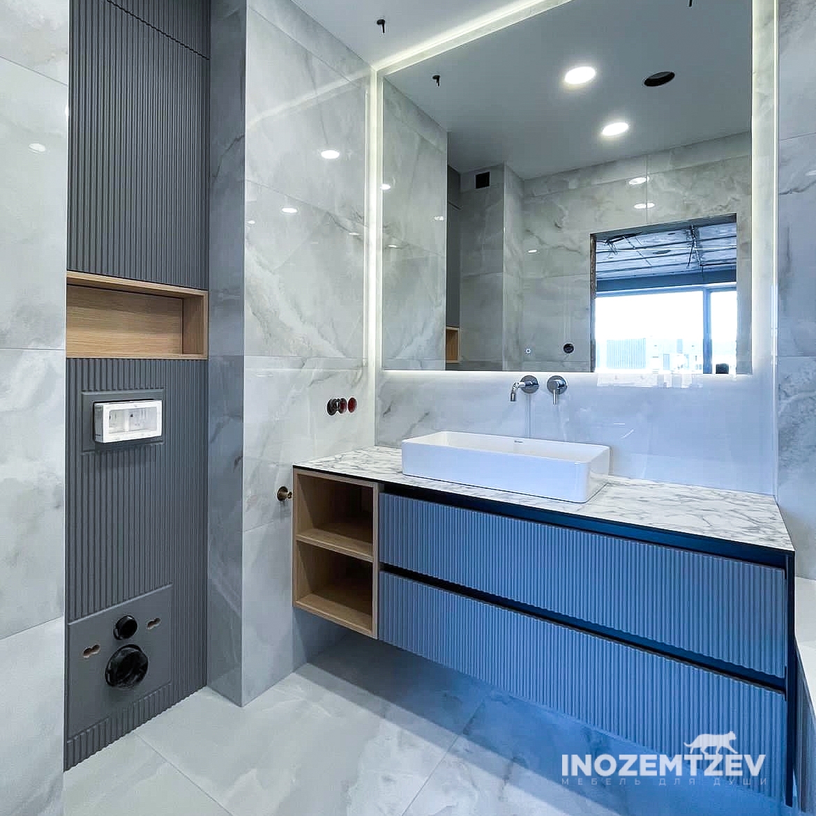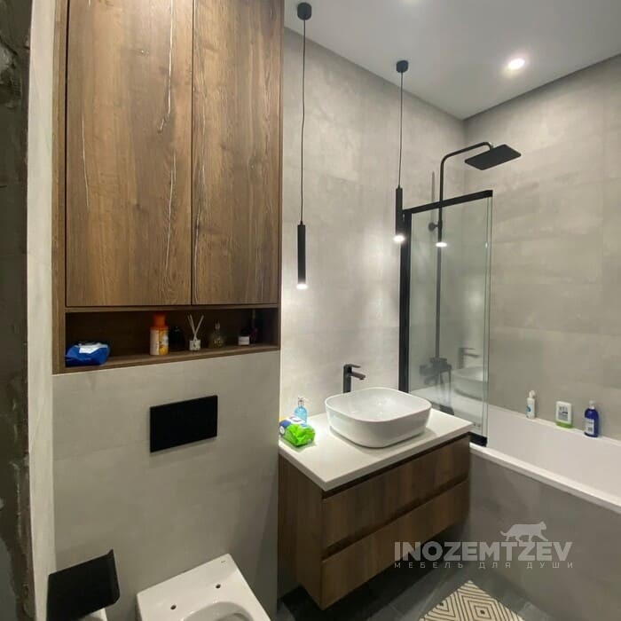 Стильный комлекс мебели в ванную комнату: шкаф для инсталляции и подвесная тумба, фасадная часть выполнена из фрезерованного МДФ, корпус и открытые полки - ЛДСП Egger текстурные и белый влагостойкий