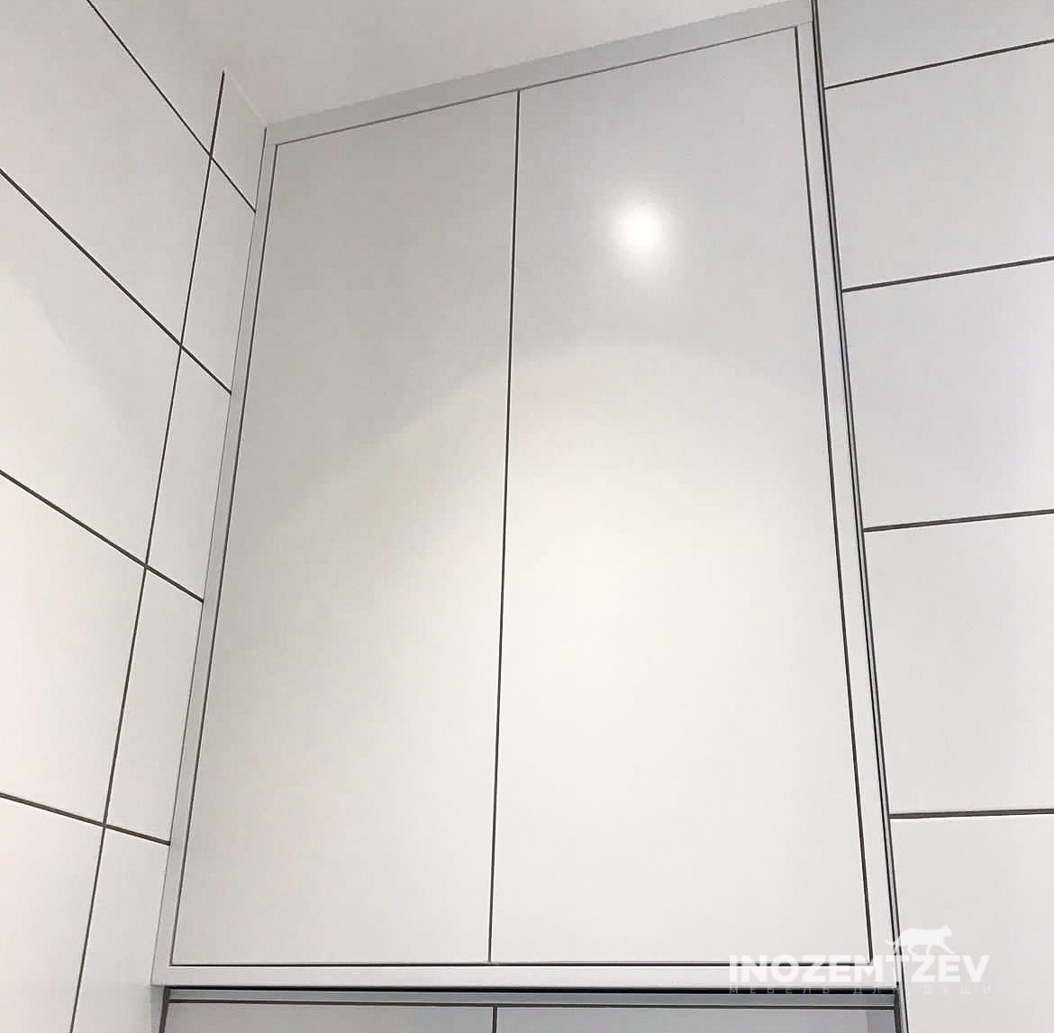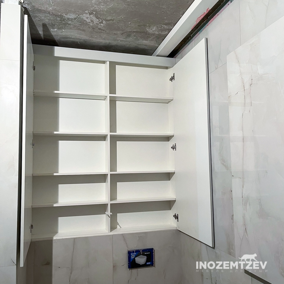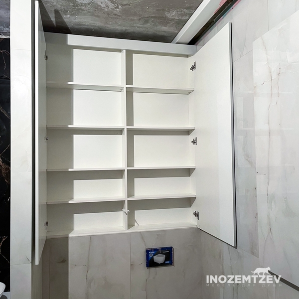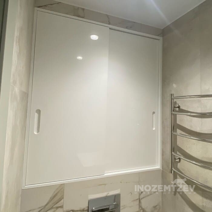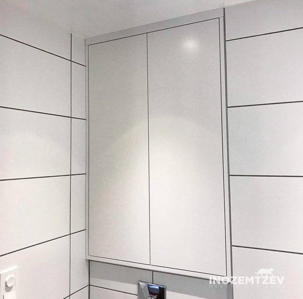 Белый шкаф над инсталляцией, 1550x1254x187 мм. Изготовлен из МДФ эмали по RAL, корпус - ЛДСП Egger Белый влагостойкий, нажимная система открывания